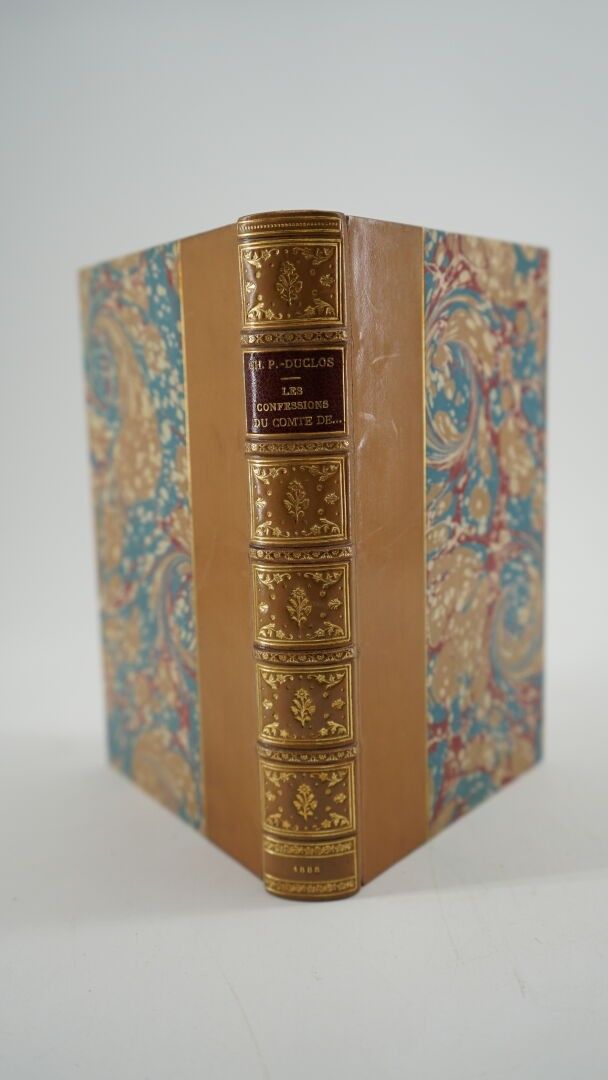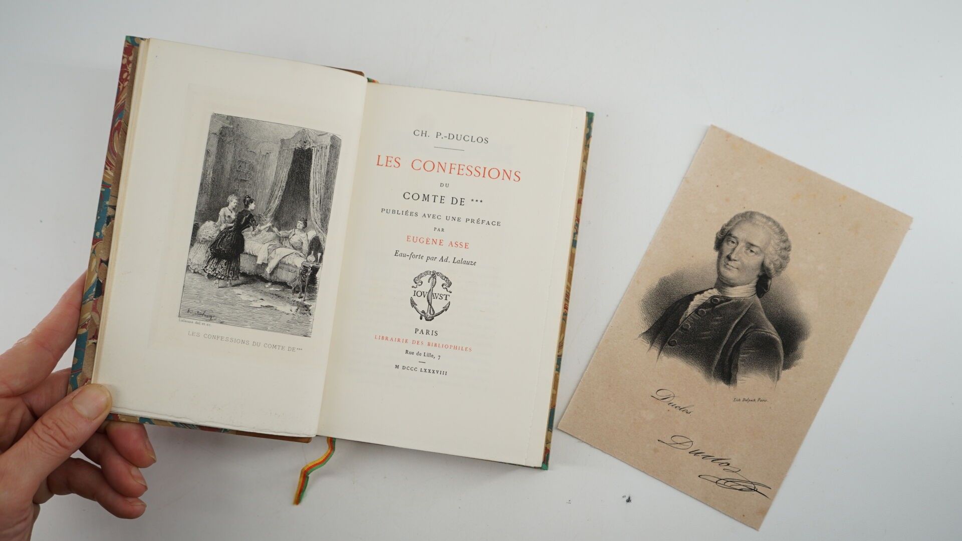 DUCLOS (Charles Pinot) - Les confessions du Comte de *** publiées avec une préface par Eugène Asse - Paris ; Librairie des Bibliophiles, 1888 - 1 volume In-12° - Frontispiece by Ad. Lalauze engraved in etching - Contemporary binding in glazed fawn half calf signed Victor Champs - Covers and spine preserved - Spine ribbed and nicely decorated in the 18th century style and dated in gold - Title page in burgundy morocco - A very fine copy printed in a small number, here numbered on Whatman (n°28 of 20, first edition: 40), with a double state of the frontispiece - Attached: 1 engraved 19th century portrait of the author on a sheet.