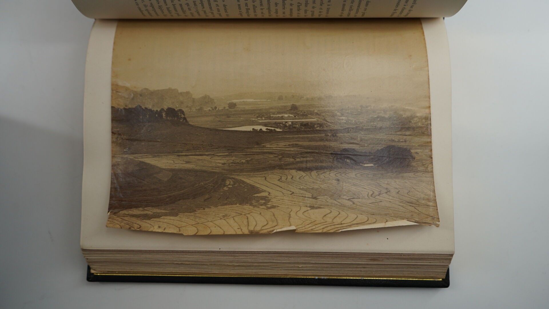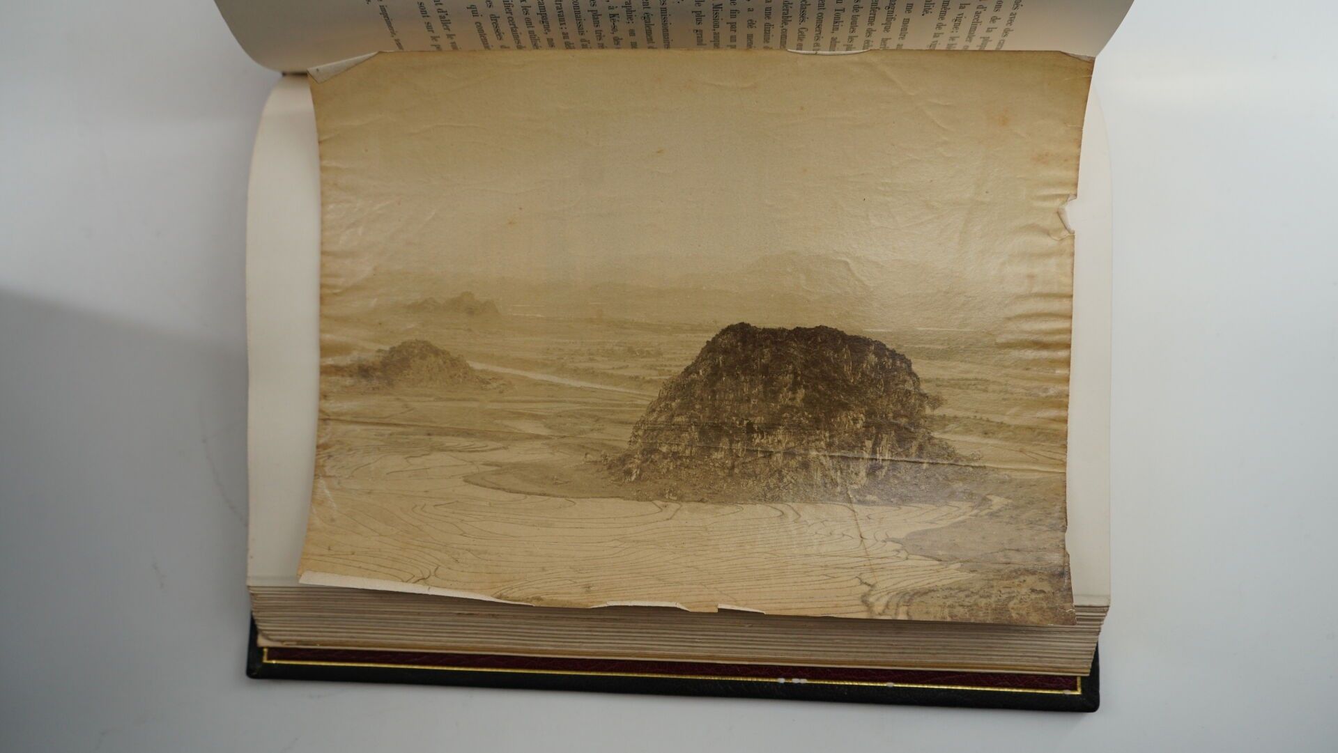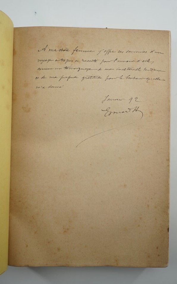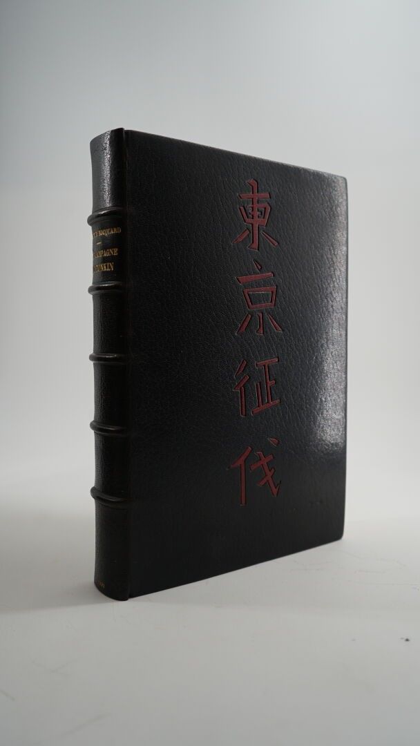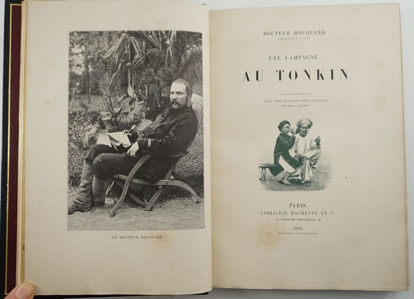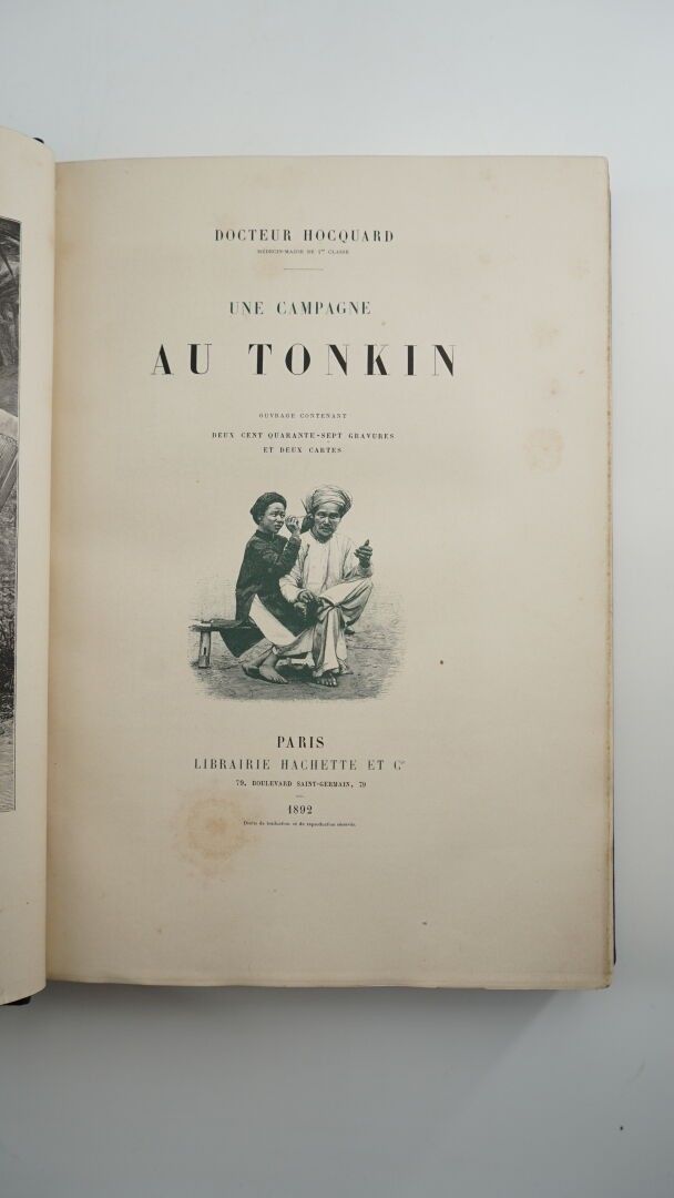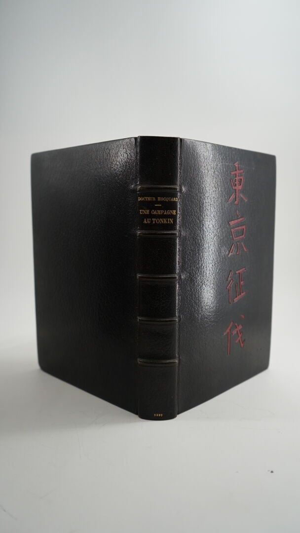 HOCQUARD (Docteur, Charles Édouard) - Une campagne au Tonkin - Paris ; Librairie Hachette, 1892 - 1 volume large In-8° - Some foxing at the beginning of the work - Portrait frontispiece, 247 photogravures in text, some full-page, 2 maps - Beautiful black morocco binding in bordered slipcase signed Canape et Corriez - Covers (foxed) preserved - 1st plate mosaicked with red morocco sinograms - Bordeaux morocco spine boards framed with 1 fillet, burgundy moire endpapers - spine ribbed, titled and dated in gold - gilt edges on witness - Copy enriched with 3 In-8° photographs of the author on albumen paper located on the spines - Autograph signed letter from the author to his wife on 1 of the white endpapers: "To my dear wife I offer these memories of a journey undertaken and told for the love of her, as a testimony of my unalterable tenderness and my deep gratitude for the happiness she has given me. January 92". An army medical officer and amateur photographer, Hocquard was sent to Tonkin in 1884-85.