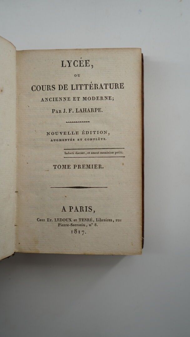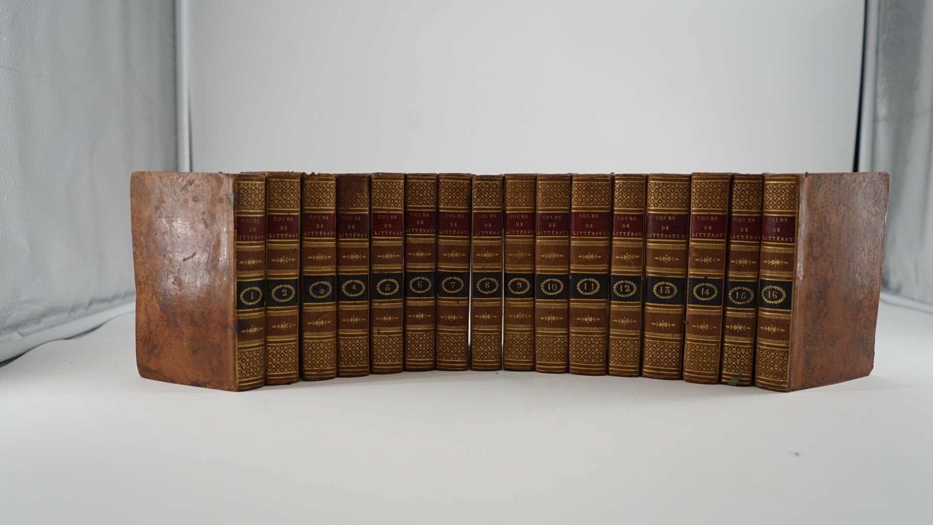 LAHARPE (J. F.) - Lycée, ou cours de littérature ancienne et moderne - Paris ; Et. Ledoux et Tenré, 1817 - 16 volumes In-18° - Bound in marbled havana basane (corners dulled) - Spines smooth and nicely decorated - Titles in burgundy morocco, headpieces in black calf - Beige edges speckled with red.