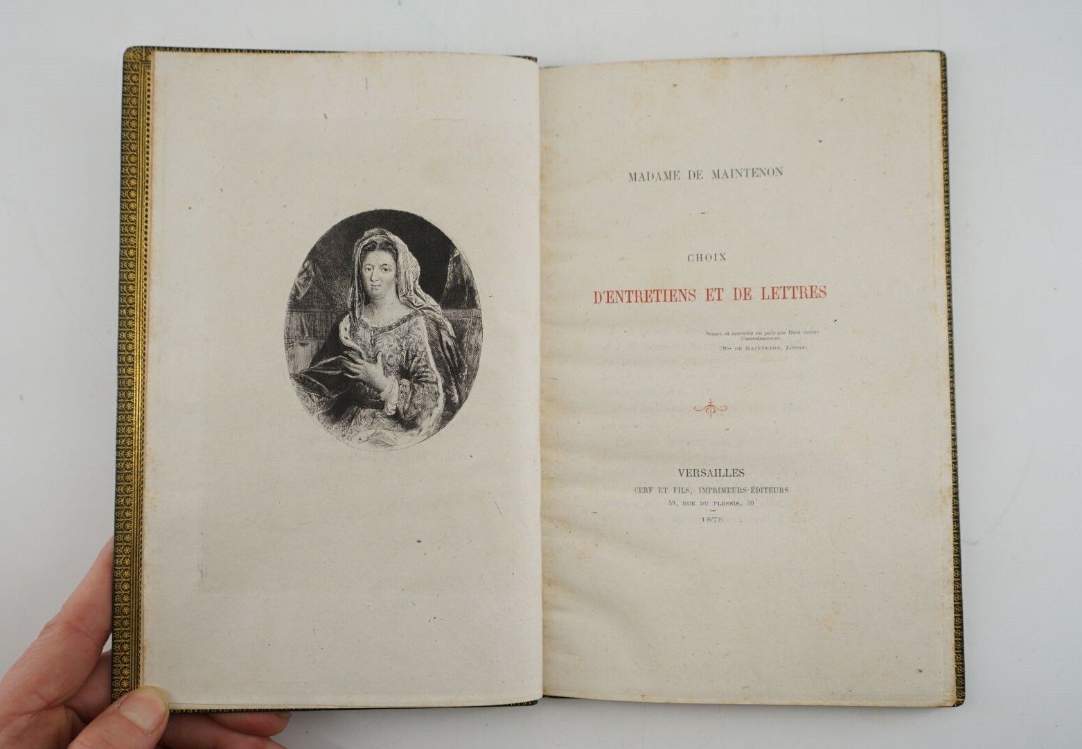 MAINTENON (Madame de) - Choix d'entretiens et de lettres - Versailles ; Cerf et Fils, 1875 - 1 volume In-8° - Engraved frontispiece portrait - Beautiful fir green contemporary binding signed Gruel - Cold fillet and central gilt crowned cross on covers, wide inner lace, double fillet on edges - Spine ribbed and decorated with cold fillets, titled, localized and dated in gold - Gilt head - Very fine copy on China paper, nominative, printed for Mme Émile Delaplame.