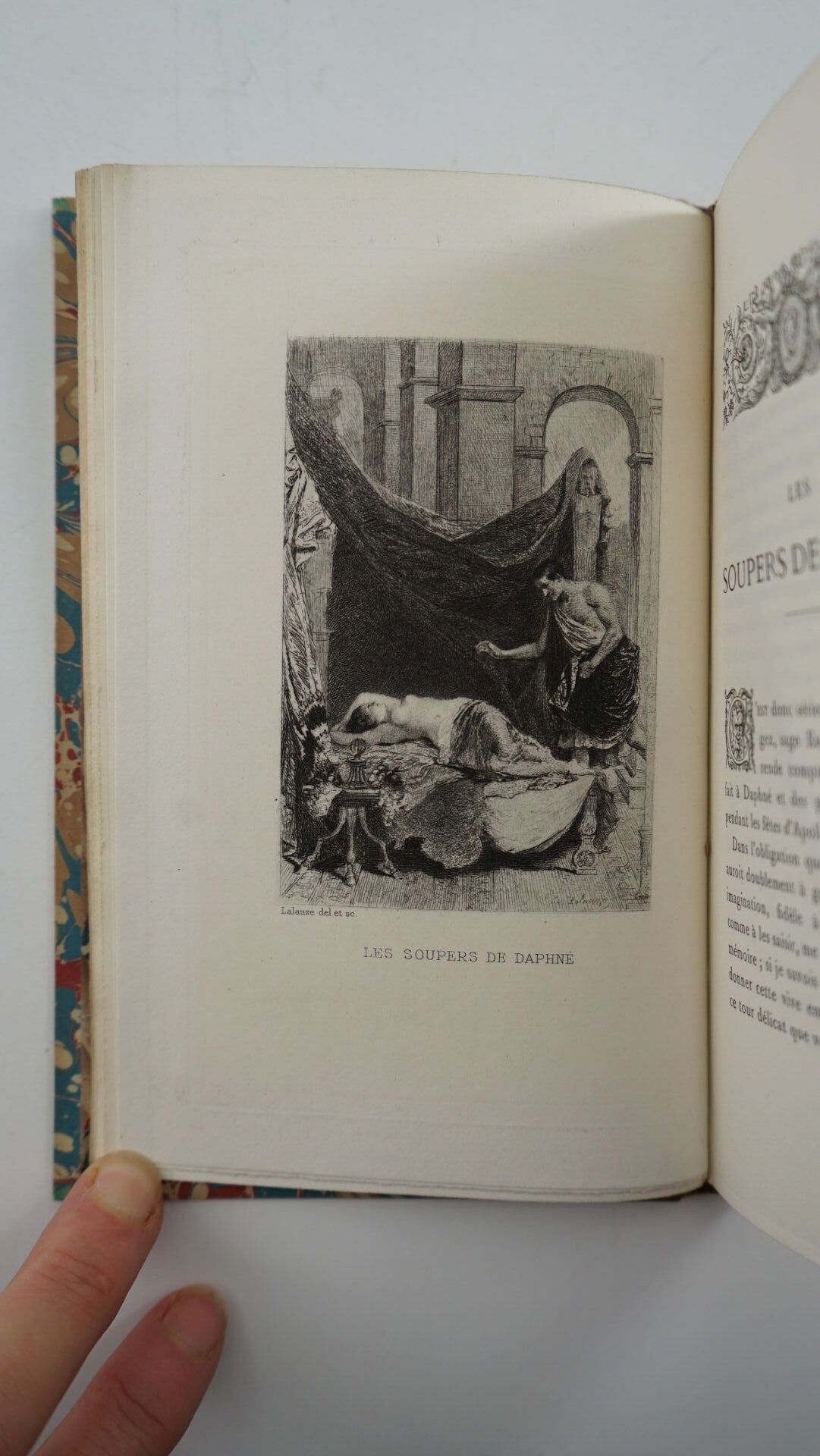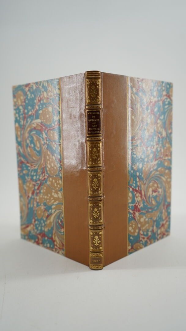 MEUSNIER DE QUERLON - Les soupers de Daphné suivis des dortoirs de Lacédémone publiés avec une préface et des notes de Maurice Tourneux - Paris ; Librairie des Bibliophiles, 1886 - 1 volume In-12° - Frontispiece by Ad. Lalauze engraved in etching - Contemporary binding in glazed fawn half calf signed Victor Champs - Covers and spine preserved - Spine ribbed and nicely decorated in the 18th century style and dated in gold - Title page in burgundy morocco - A very fine copy printed in a small number, here numbered on Whatman (n°3 of 20, first edition: 40), with a double state of the frontispiece.