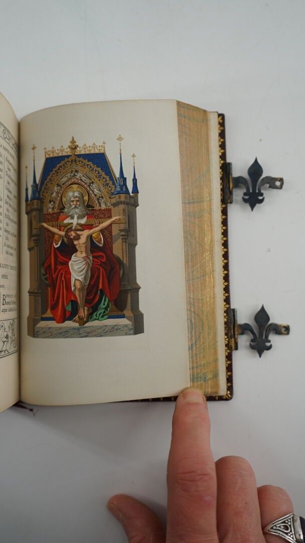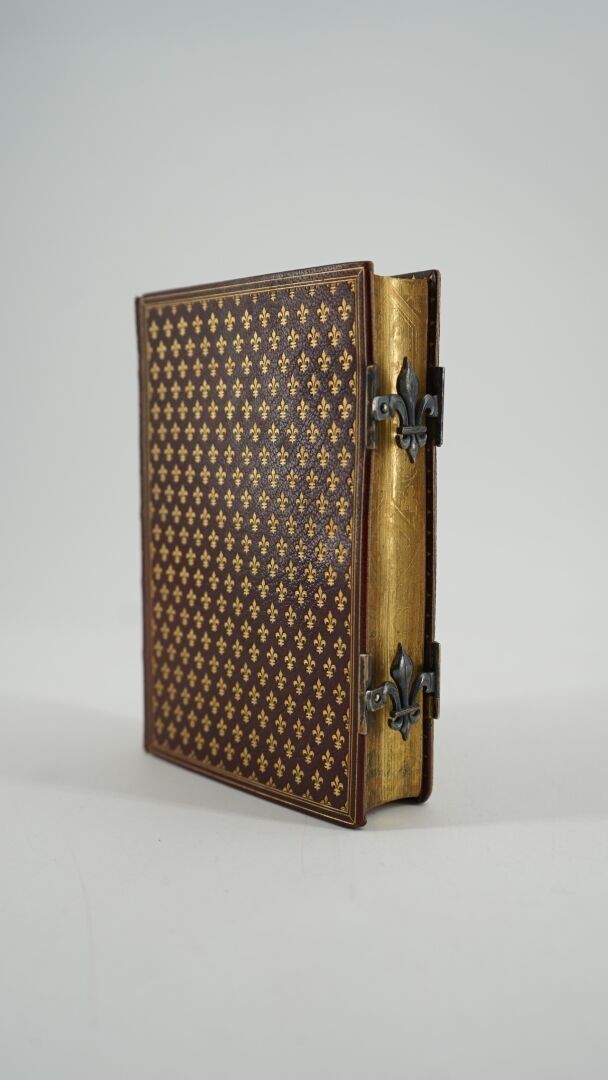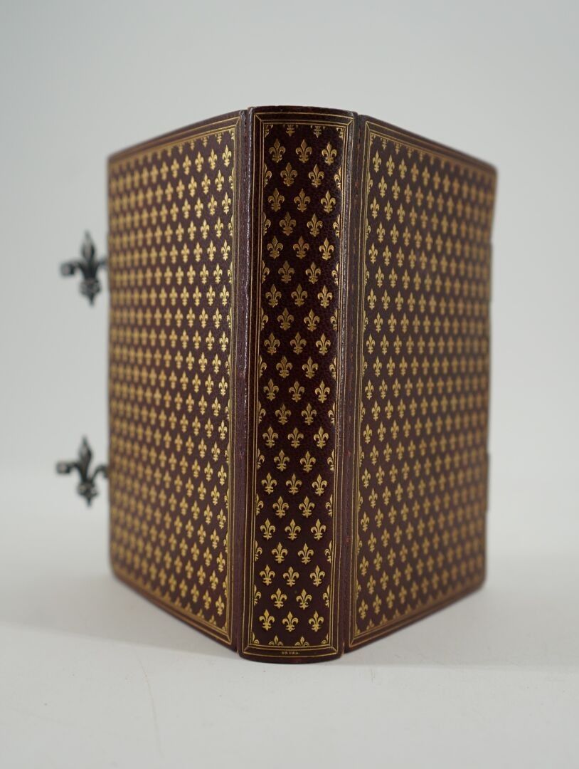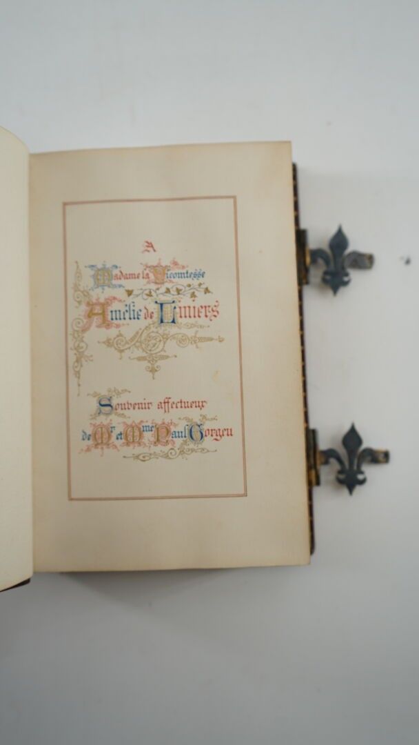 [RELIGIOSA] - Paroissien de la Renaissance, contenant les offices des dimanches et fêtes de l'année selon le rite romain - Paris ; Gruel Engelmann, 1874 - 1 volume In-12° - Printed on laid paper - 8 beautiful plates out of text in chromolithography, text framed by large engraved friezes - Beautiful contemporary burgundy morocco binding with 2 metal fleur-de-lys clasps signed Gruel (1st jaw split over 2 cm and partially cracked) - Triple fillet and fleur-de-lys borders to boards - fleur-de-lys framing to covers. fleurdelisé framing on burgundy moire-lined boards and endpapers - smooth spine decorated identically to boards - gilt and chased edges on marbled boards - handsome handwritten and illuminated ex-dono on 1st white endpaper: "To Madame la Vicomtesse Amélie de Liniers. Souvenir affectueux de Mr et Mme Paul Gorgeu - A good copy.