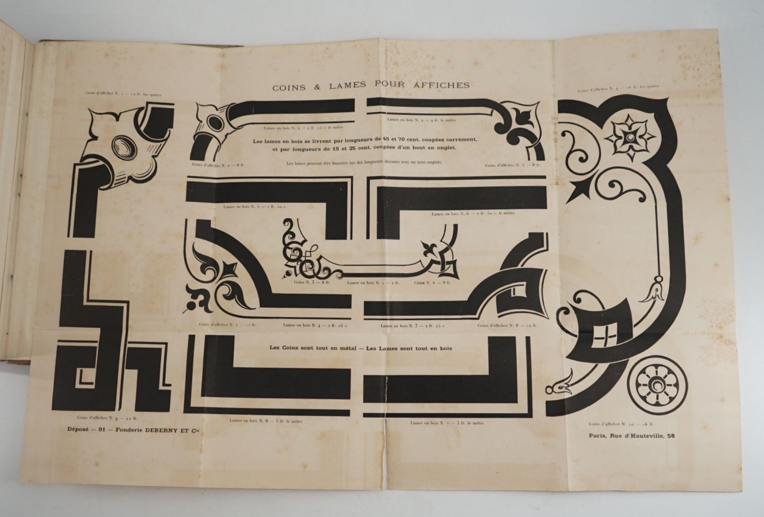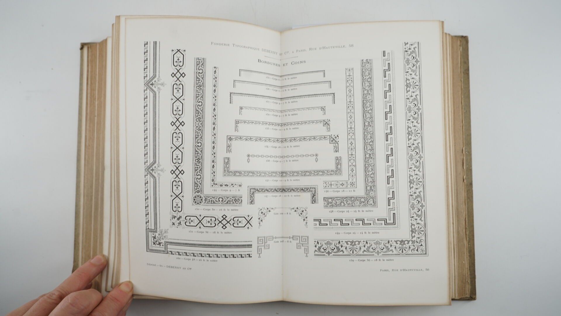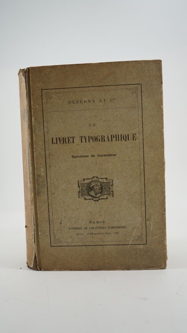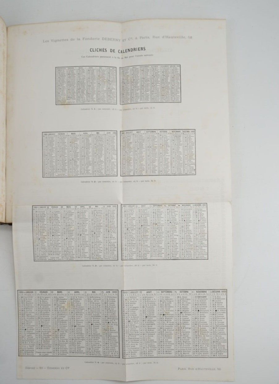 [TYPOGRAPHY] - DEBERNY & Cie - Le livret typographique. Spécimen de caractères - Paris ; Fonderie de Caractères d'Imprimerie, [circa 1910] - 1 large volume In-8° - 1 leaf with small cut-out gap - Very many specimens of typefaces and typographical ornaments - 1 fold-out plate of calendars, 1 fold-out plate of ornamented fillets for posters and 1 other of corners and blades for posters - Bound in Bradel-style grey hardback (1st spine and back rubbed, headbands worn) - Working copy from the Raoul Ivonnet, Henri Potier et Fils printing works in La Roche-sur-Yon.