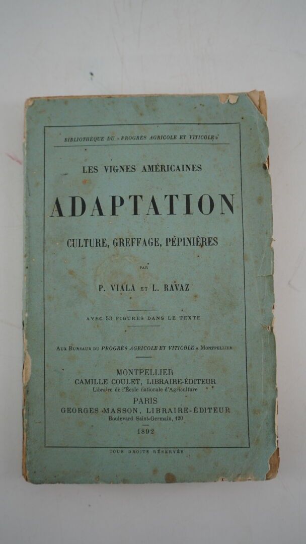 VIALA (P.) & RAVAZ (L.) - Les vignes américaines adaptation, culture, greffage, pépinières - Montpellier ; Camille Coulet, Paris ; Georges Masson, 1892 - 1 volume In-12° paperback (small tears in the margins of the covers, spine rebacked with small tears) - Figures in text.