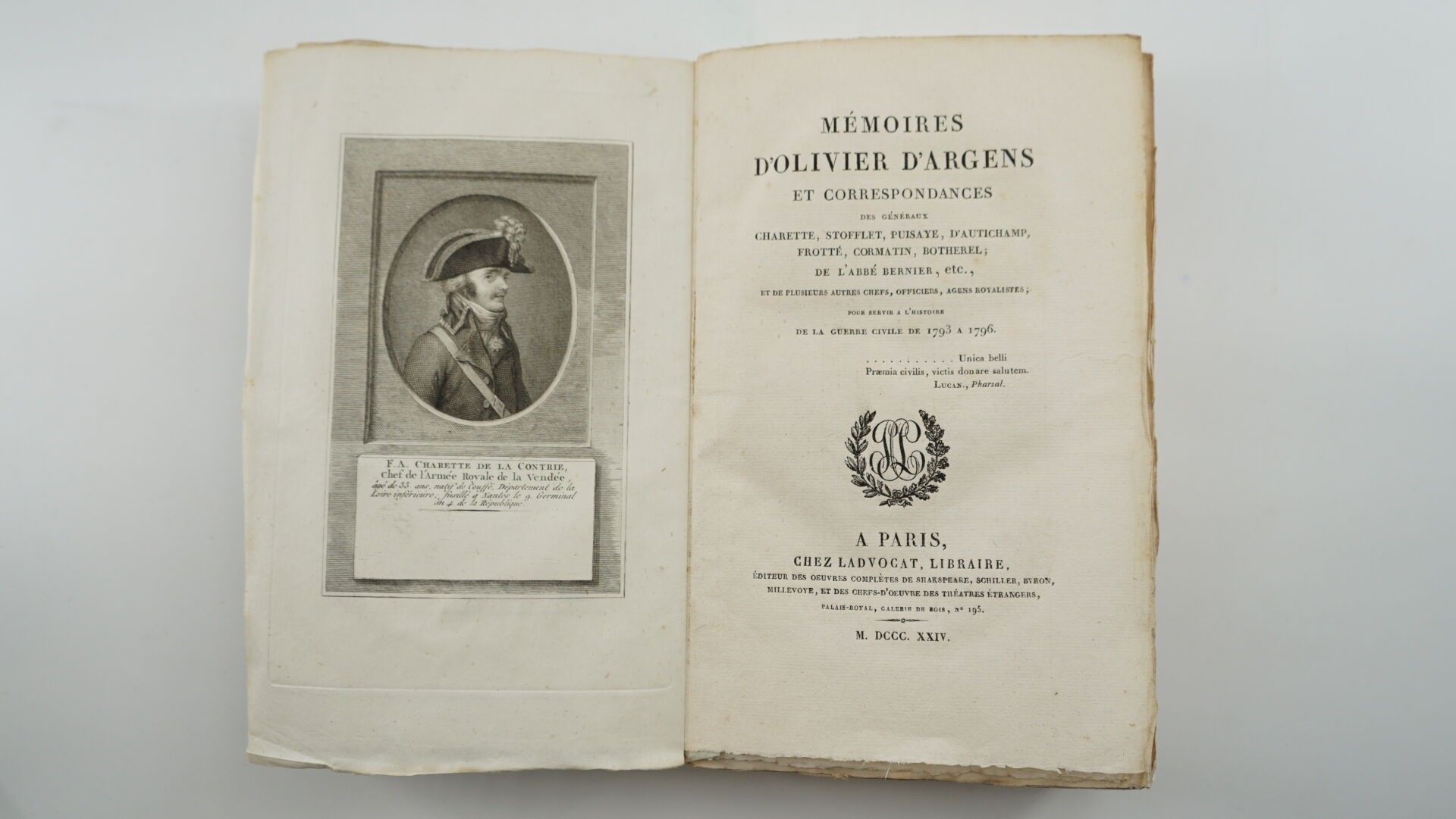 ARGENS (Olivier d') - Mémoires d'Olivier d'Argens et correspondances des généraux Charrette, Stofflet, Puisaye, d'Autichamp, Frotté, Cormatin, Botherel ; de l'abbé Bernier, etc., et de plusieurs autres chefs, officiers, agens royalistes ; pour servir à l'histoire de la guerre civile de 1793 à 1796 - Paris ; Ladvocat, collection Mémoires relatifs à la Révolution française, 1824 - 1 volume In-8° paperback (spine slightly soiled) - Frontispiece portrait of Charette - Good copy.