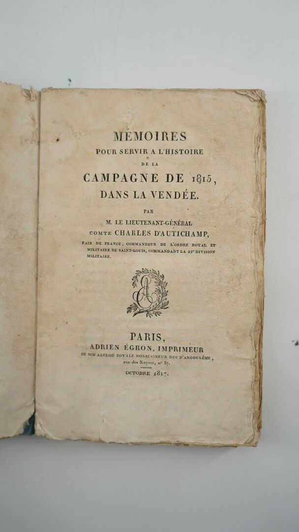 AUTICHAMP (Lieutenant-General Comte Charles d') - Mémoires pour servir à l'histoire de la Campagne de 1815, dans la Vendée - Paris ; Adrien Égron, octobre 1817 - 1 volume In-8° paperback in waiting cover (spine faded) - First edition.