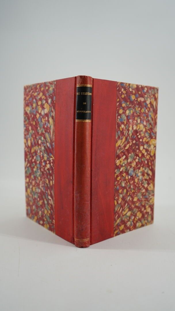 BABEUF (François-Noël, known as Gracchus)] - Du système de dépopulation, ou la vie et les crimes de Carrier ; son procès, et celui du Comité révolutionnaire de Nantes. Avec des recherches et des considérations politiques sur les vues générales du Décemvirat, dans l'invention de ce systême ; sur sa combinaison principale avec la Guerre de la Vendée ; et sur le projet de son application à toutes les parties de la République - Paris ; Imprimerie de Franklin, an 3 [1794] - 1 volume In-8° - 194 pages (i.e. 192, skipped without missing from 152 to 155) - Engraved frontispiece portrait of Carrier - Yellowed leaves - Bound in 19th century half cherry percale à la Bradel - Spine decorated (slightly faded) with black percale title page - Good copy in rare 2nd edition published the same year in which Babeuf exposes the original opinion that the Vendée war is the consequence of 1 deliberate policy whose aim is 1 extermination organised by the revolutionary government of which Carrier is the armed wing.