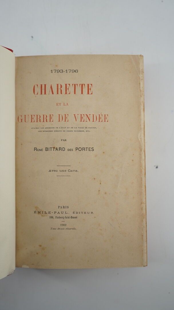BITTARD DES PORTES (René) - 1793-1796 : Charette et la guerre de Vendée - Paris ; Émile Paul, 1902 - 1 volume In-8° - Some scattered freckling at the beginning and end of the work - 1 folding map in fine - Bound in the 2nd half of the 20th century in cherry half-chagrin with corners - Covers preserved - Spine ribbed with gold titling - First edition.