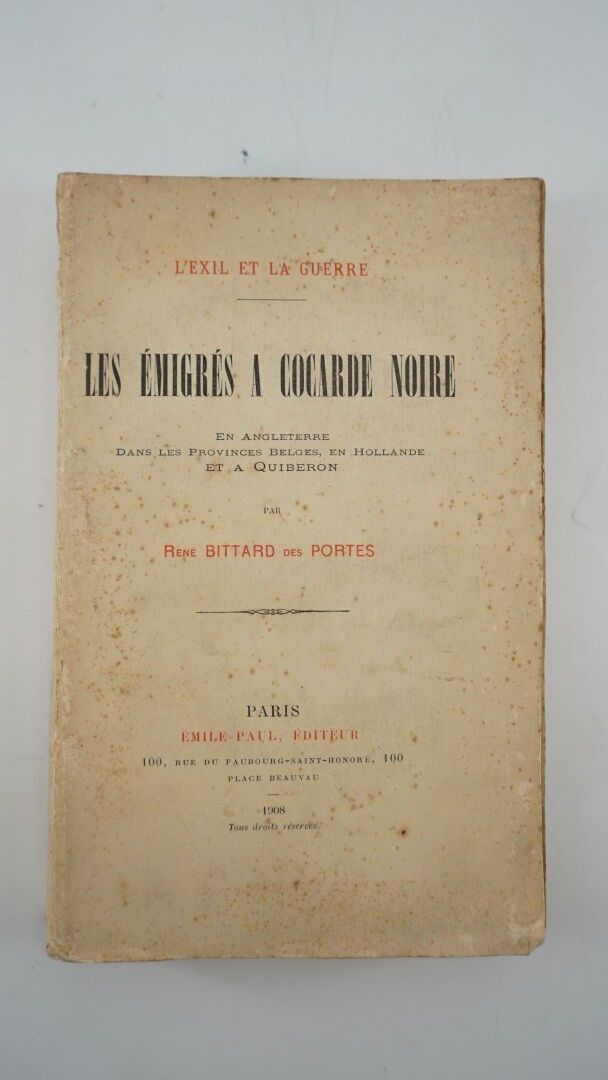 BITTARD DES PORTES (René) - Exile and war. Les émigrées à cocarde noire en Angleterre, dans les provinces belges, en Hollande et à Quiberon - Paris ; Émile-Paul, 1908 - 1 volume In-8° paperback - Handwritten bookplate on the 1st white endpaper: Comte du Tertre - Good copy in first edition.