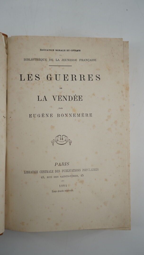 BONNEMÈRE (Eugène) - Les guerres de la Vendée - Paris ; Librairie Centrale des Publications Populaires, 1884 - 1 volume In-8° - Minor scattered foxing - Full-page engravings - Bound in half fawn basane à la Bradel - 1st cover preserved - Good copy in 2nd edition.
