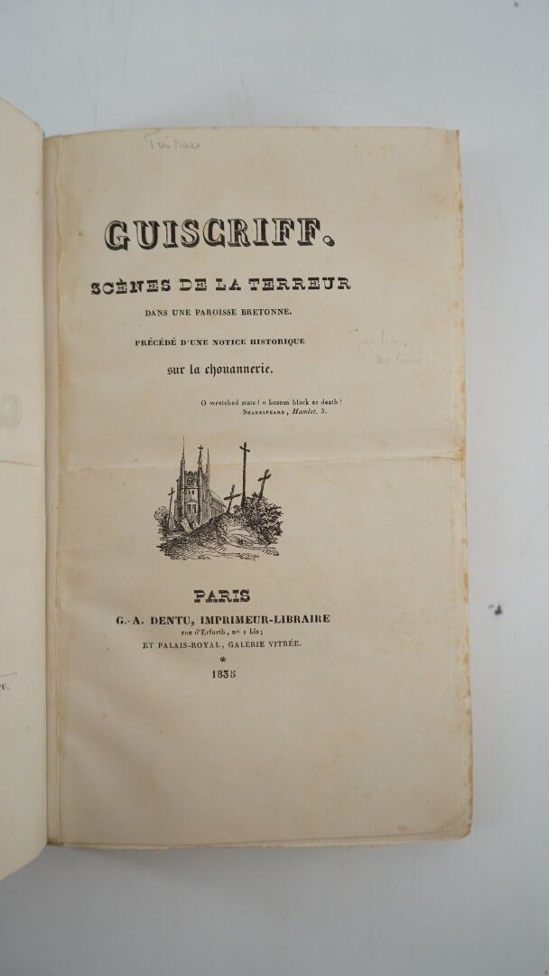 [CARNÉ (Louis de)] - Guiscriff, scenes of the Terror in a Breton parish. Précédé d'une notice historique sur la chouannerie - Paris ; G.-A. Dentu, 1835 - 1 volume In-8° - Small bottom of the first 5 leaves restored - Slightly later binding in fawn half calf - Spine ribbed and decorated (3 boxes worn) - Green morocco title-piece, date-piece missing - A good copy of the first edition.