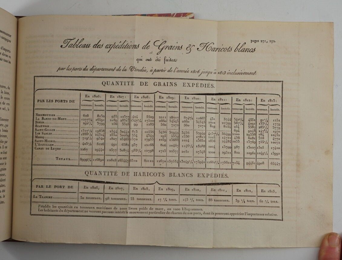 CAVOLEAU (Jean-Alexandre) - Description du Département de la Vendée, et considérations générales sur la guerre civile de 1793, 1794 et 1795 - Nantes ; Victor Mangin, 1818 - 1 volume In-8° - 1 angular halo in fine - 1 folding table in text - Bound in modern havana half-basin - Smooth mute spine - Very good copy in first edition. The part of this work which concerns the Wars of Vendée, and bears the name of Historical Notice includes pages 345 to 369; it ends with the reproduction of the interrogation of d'Elbée pages 363 to 369.