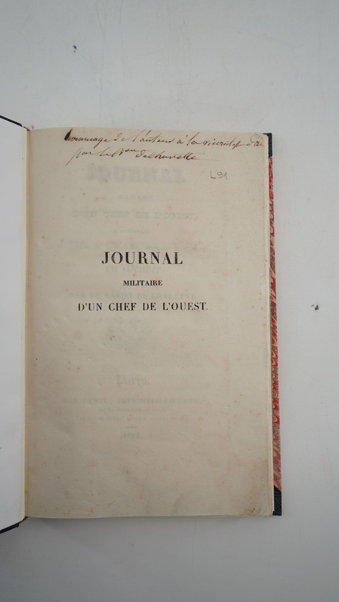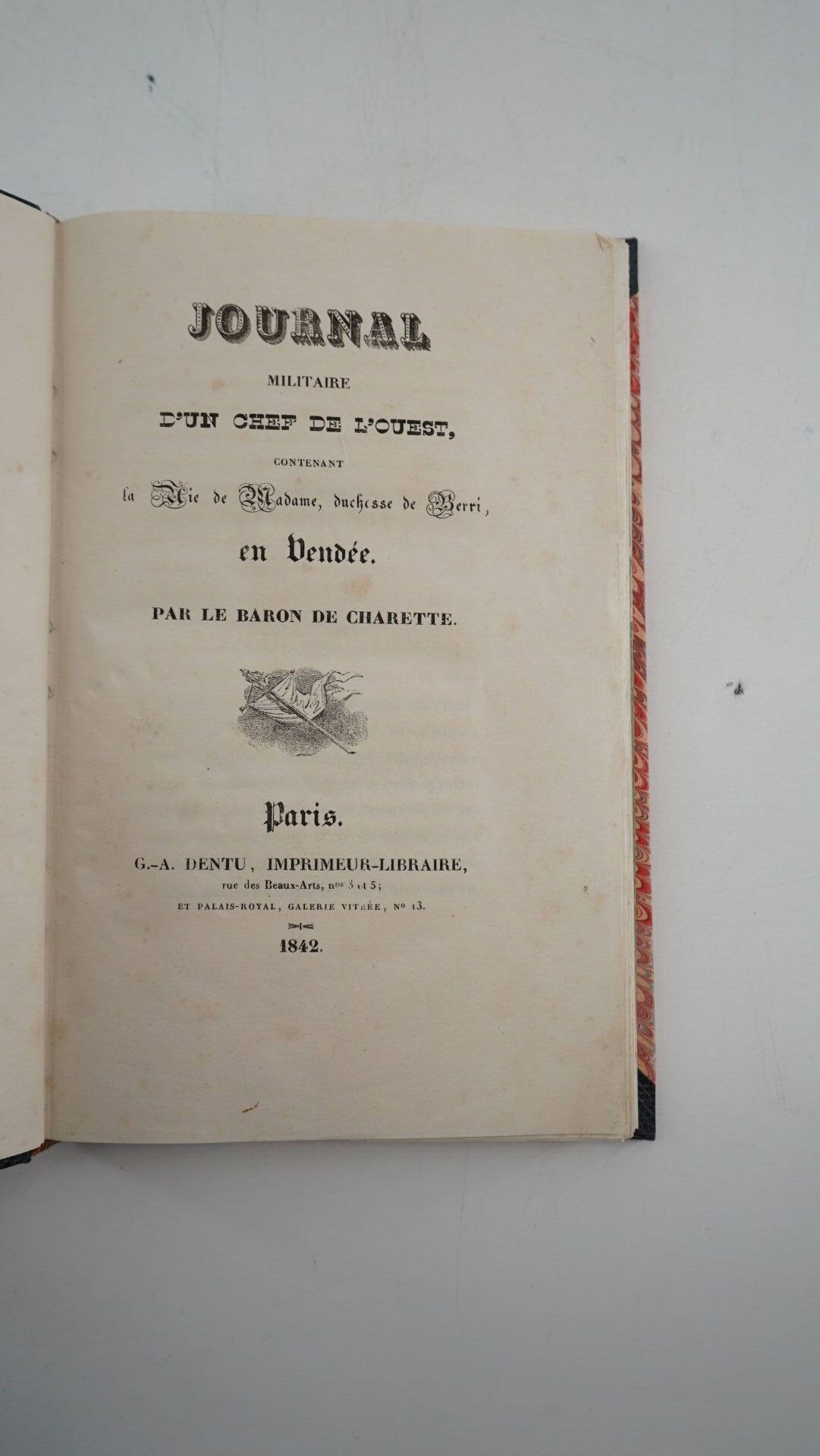 CHARETTE (Anasthase-Charles-Marin, Baron de) - Journal militaire d'un chef de l'Ouest contenant la vie de Madame, duchesse de Berri, en Vendée - Paris ; G.-A. Dentu, 1842 - 1 volume In-8° - Bound in the 2nd half of the 20th century in black half-chagrin à la Bradel with small corners - Covers preserved (the 1st restored) - Smooth spine titled in gold throughout - Original edition in the hand of the nephew of the leader of the insurrection, with autograph letter signed to the false title.