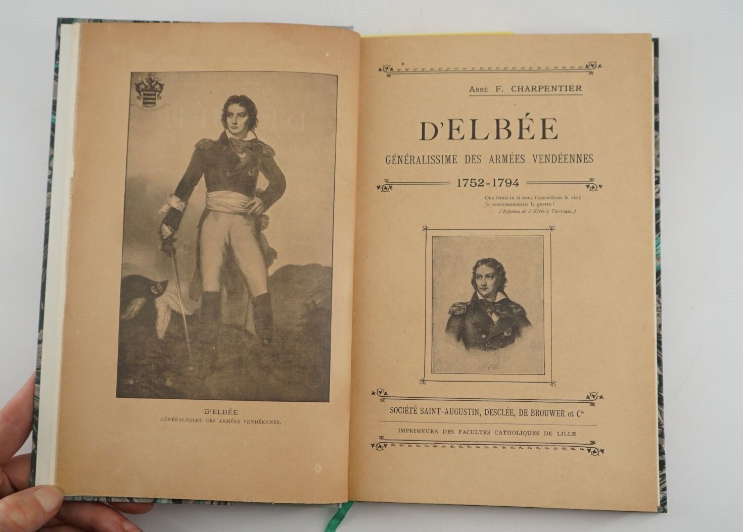 CHARPENTIER (Abbé Ferdinand) - D'Elbée généralissime des armées vendéennes 1752-1794 - Lille ; Société Saint-Augustin, Desclée, de Brouwer et Cie, 1905 - 1 volume In-8° - Portrait frontispiece, vignette to the title, illustrations in text - Binding 2nd half of the 20th century half grey cloth à la Bradel - Covers preserved (the 1st illustrated) - Green calf title with gold spine - Very good copy in first edition.
