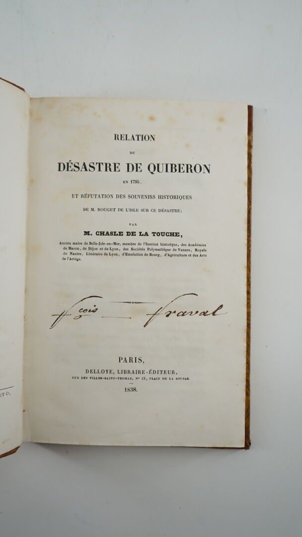 CHASLE de LA TOUCHE (M.) - Relation du désastre de Quiberon en 1795, et réfutation des souvenirs historiques de M. Rouget de l'Isle sur ce désastre - Paris ; Delloye 1838 - 1 volume In-8° - A few scattered freckles - Contemporary half calf binding - Smooth spine decorated and titled in gold - Handwritten bookplate on title: Fçois Fraval - Good copy in original edition.