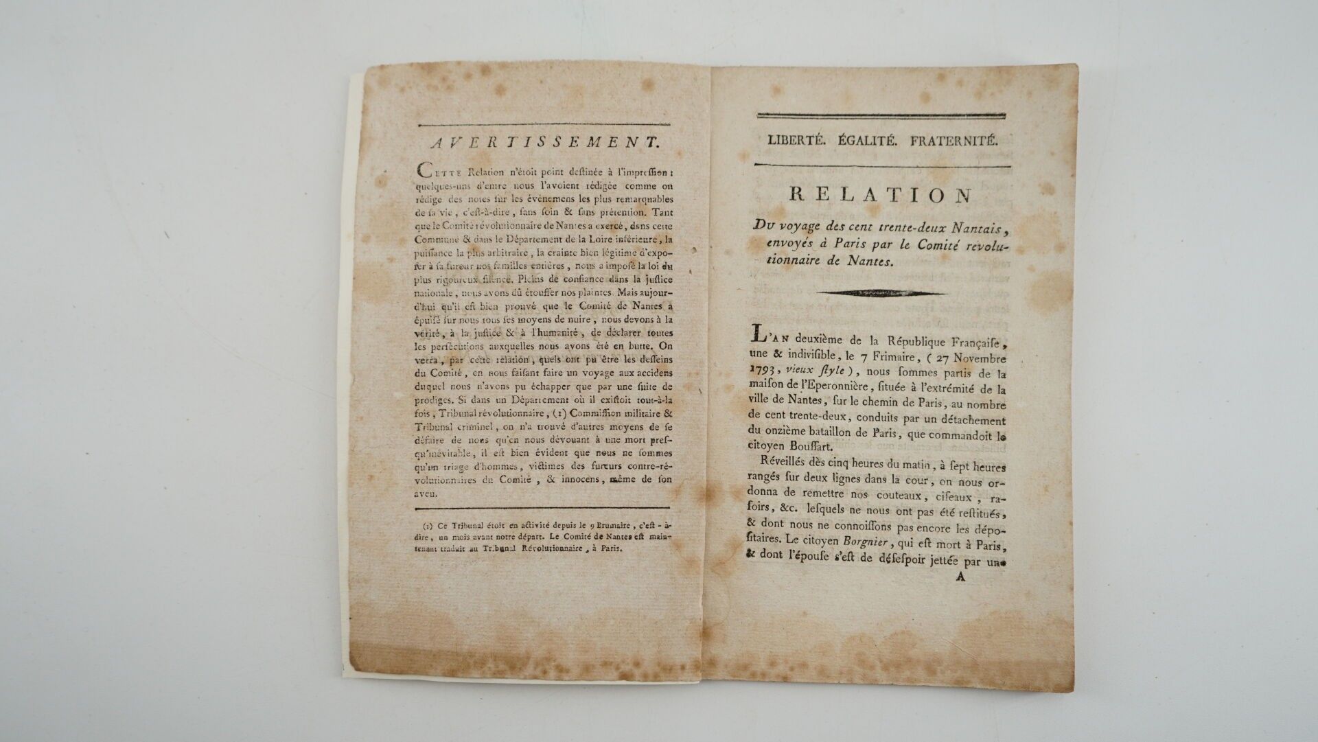 [COLLECTIF] - Relation du voyage des cent trente-deux Nantais, envoyés à Paris par le Comité révolutionnaire de Nantes - Paris ; Maison Égalité, an II [1794] - 1 pamphlet In-12° paperback with modern soft cover - Some foxing - Uncommon.