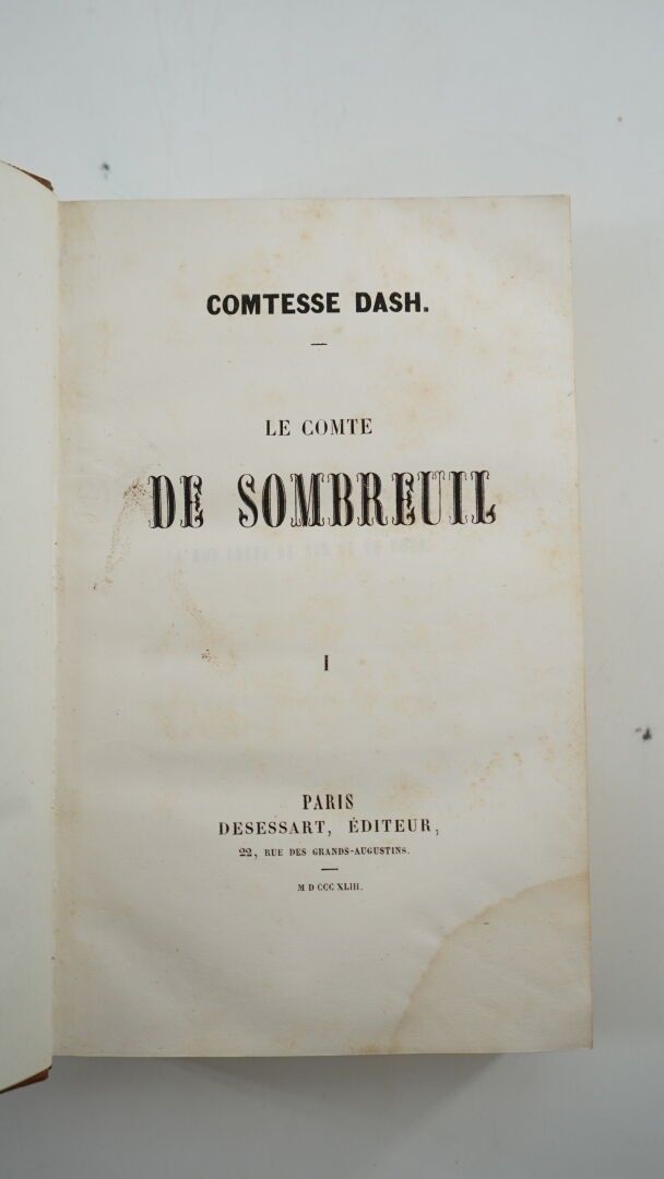 COMTESSE DASH (Gabrielle Anna de Cisternes de Courtiras, dite) - Le comte de Sombreuil - Paris ; Desessart, 1843 - 2 volumes in 1 volume In-8° - Angular aureole on the first 63 leaves, a few rare scattered freckles - Bound in contemporary havana half calf - Smooth spine decorated - Title page in orange and blue paper, tomaison page in green paper - Yellow edges - A good copy. Charles Eugène Gabriel de Virot de Sombreuil, born on 11 July 1770, died on 28 July 1795, was shot in Vannes for his participation in the Quiberon expedition, an attempt by the Émigrés to land in Brittany.