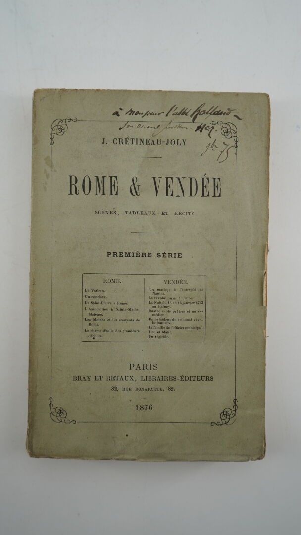 CRÉTINEAU-JOLY (J.) - Rome & Vendée. Scènes, tableaux et récits - Paris ; Bray et Retaux, 1876 - 1 volume In-8° paperback - Some scattered foxing - Autograph signed letter from the author to the front cover.