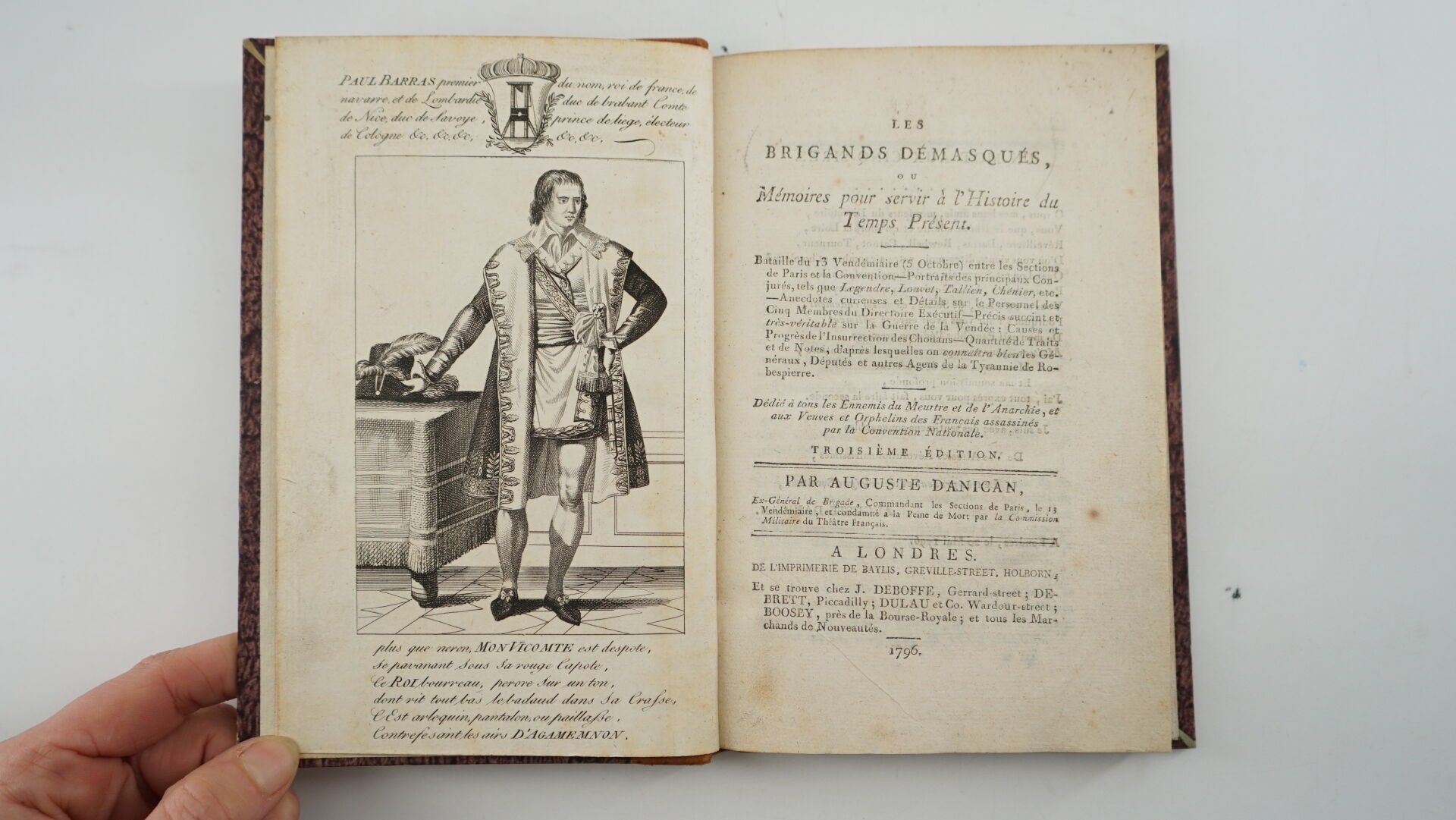 DANICAN (Auguste) - Les Brigands Démasqués, ou Mémoires pour servir à l'Histoire du Temps Présent - London ; Imprimerie de Baylis, 1796 - 1 volume In-8° - Marginal tear restored to the false title - Engraved frontispiece portrait of Paul Barras - Bound in the 1st half of the 20th century in half shagreen in the 18th century style - Smooth spine decorated - Title page in burgundy morocco - A good copy of the 3rd edition.
