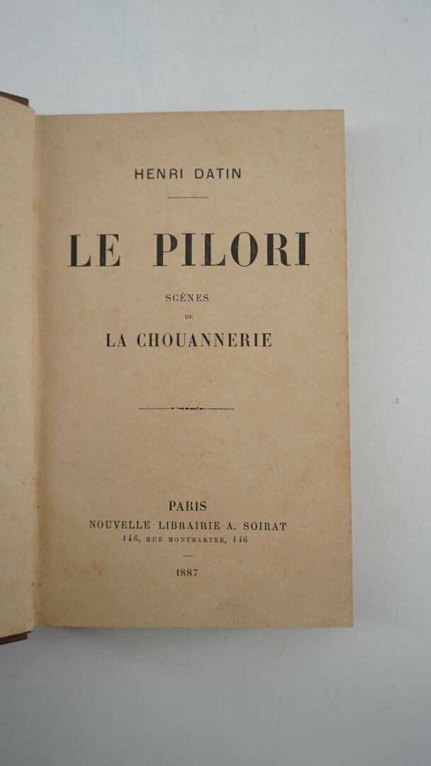 DATIN (Henri) - Le pilori. Scènes de la chouannerie - Paris ; Nouvelle Librairie A. Soirat, 1887 - 1 volume In-12° - Some foxing on some pages - Bound in contemporary brown half cloth - Smooth spine titled and dated in gold - A good first edition copy of these scenes of the Norman Chouannerie.