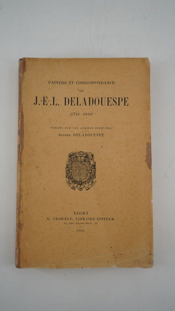 DELADOUESPE (Alfred) - Papiers et correspondance de J.-E.-L. Deladouespe (1746-1810) publiés par son arrière-petit-fils - Niort ; L. Clouzot, 1904 - 1 volume In-8° broché (1er mors recollé en partie non coupé, 1 aurole angulaire au 2nd plat) - Good copy in first edition with numerous details relating to the 3rd Vendée insurrection. Deladouespe was administrator of the Vendée department.