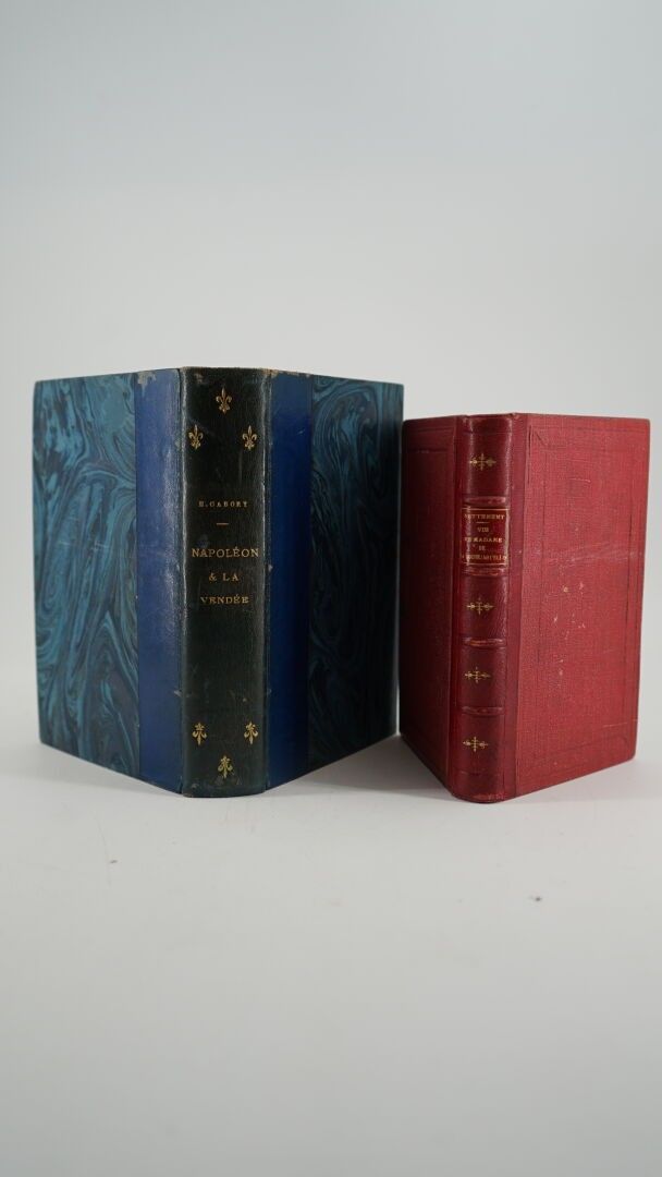 Set of 2 volumes In-8° - NETTEMENT (Alfred) - Vie de Madame la marquise de La Rochejaquelein - Paris ; Jacques Lecoffre, Lyon ; Ancienne Maison Perisse Frères, 1865 - Yellowed paper - Bound in contemporary cherry half-chagrin - Ribbed spine decorated and titled in gold - GABORY (Émile) - Napoléon et la Vendée - Paris ; Perrin et Cie, 1914 - Freckles - 1 folding map in fine - Binding mid 20th century blue half-basane - Covers and spine preserved - Smooth spine (faded) decorated with fleurs de lys and titled in gold - Red head.