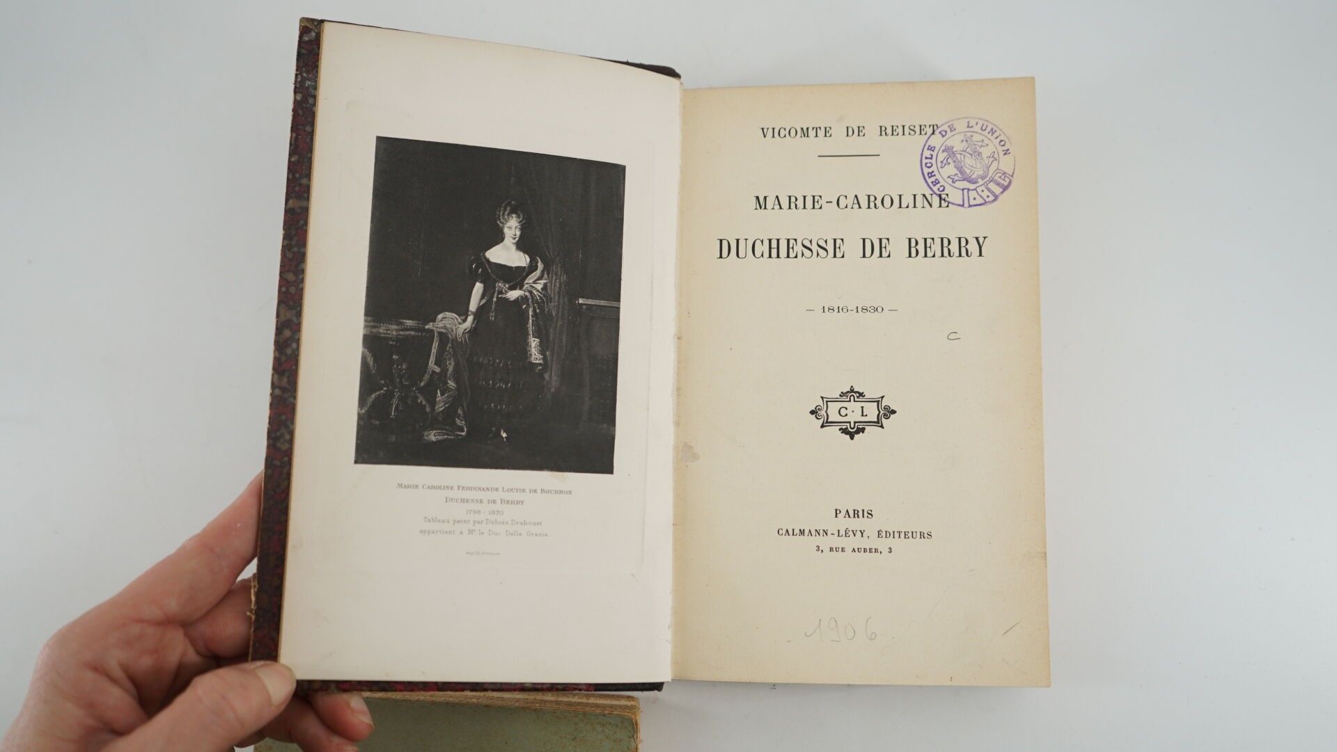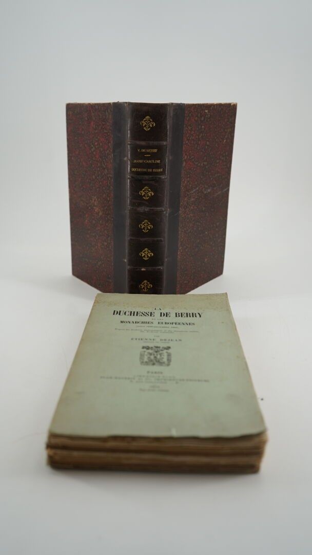 Set of 2 volumes In-8° - REISET (Vicomte de) - Marie-Caroline duchesse de Berry 1816-1830 - Paris ; Calmann-Lévy, [1906] - Portrait frontispiece - Library stamp on title - Bound in contemporary half brown basane - Spine ribbed, decorated and titled in gold with super ex-libris of the Cercle de l'Union on tail - DEJEAN (Étienne) - La Duchesse de Berry et les monarchies européennes (août 1830-décembre 1833) - Paris ; Plon, Nourrit et Cie, 1913 - 1 volume In-8° paperback (spine split) - Good set.