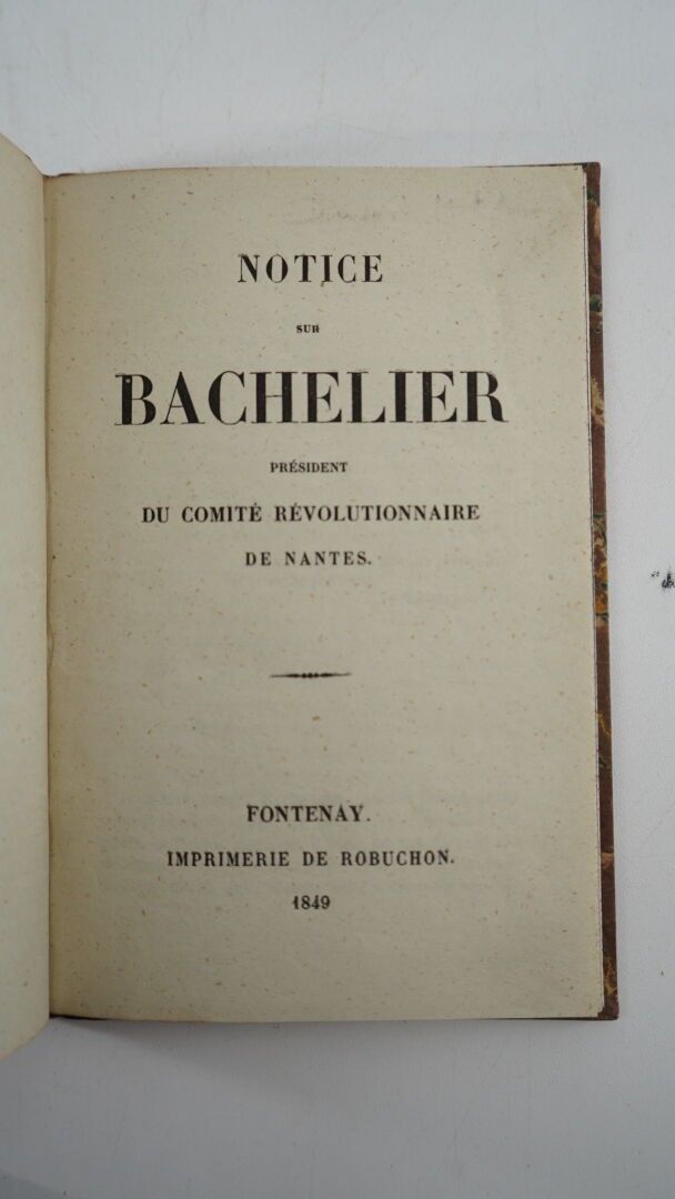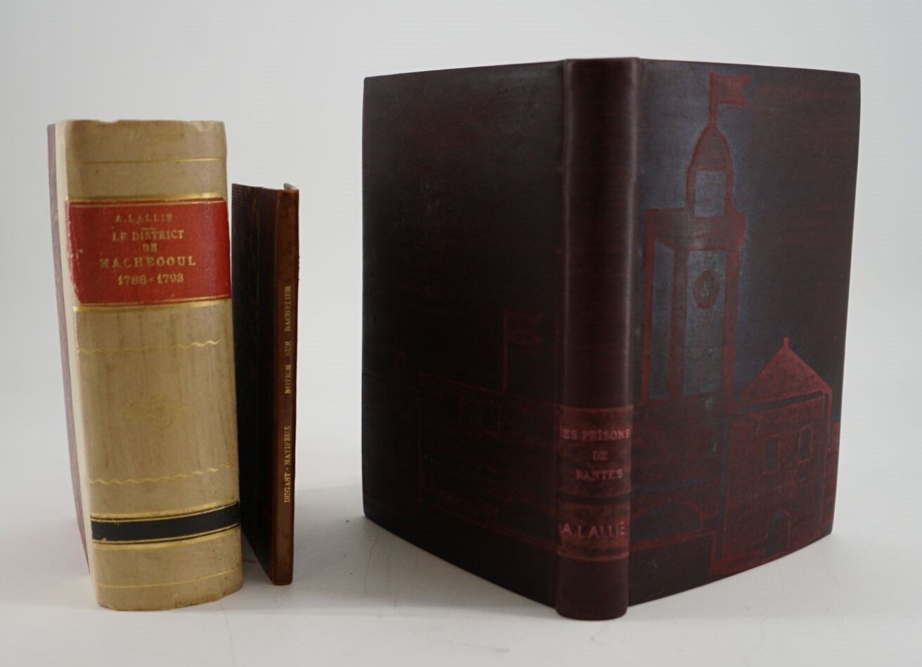 Set of 3 volumes - [DUGAST-MATIFEUX] - Notice sur Bachelier président du Comité révolutionnaire de Nantes - Fontenay ; Imprimerie de Robuchon, 1849 - 1 pamphlet In-16° - Bound in later half calf - Covers preserved - Smooth spine titled in gold throughout - Good copy with autograph dispatch from the author - LALLIÉ (Alfred) - Le district de Machecoul 1788-1793. Études sur les origines et les débuts de l'insurrection vendéenne dans le pays de Retz - Nantes ; Vincent Forest et Émile Grimaud, 1869 - 1 large volume In-12° - 4 leaves with dressing restored - Bound in beige half-cartonnage (1st spine split) - Smooth spine decorated - Title page in red paper - Handwritten bookplate on the 2nd white endpaper - DU MÊME - Les prisons de Nantes pendant la Révolution - Nantes ; Librairie Ancienne & Moderne L. Durance, 1912 - 1 volume In-8 - Nice posterior brown basane binding decorated on the 2 boards and on the spine - Covers and spine preserved - Smooth spine titled in gold - Good set.