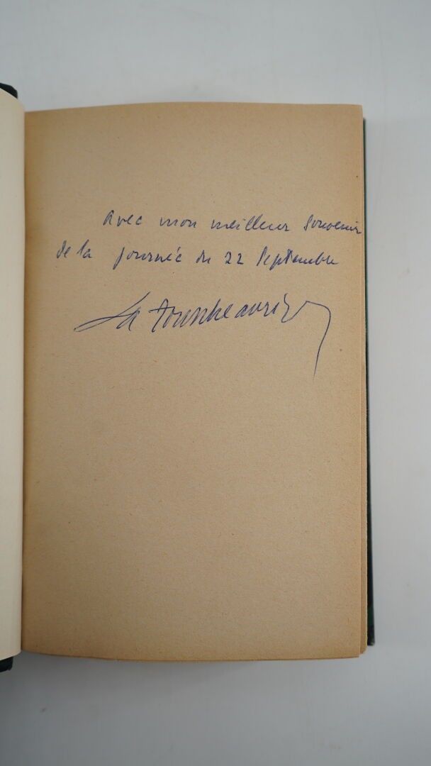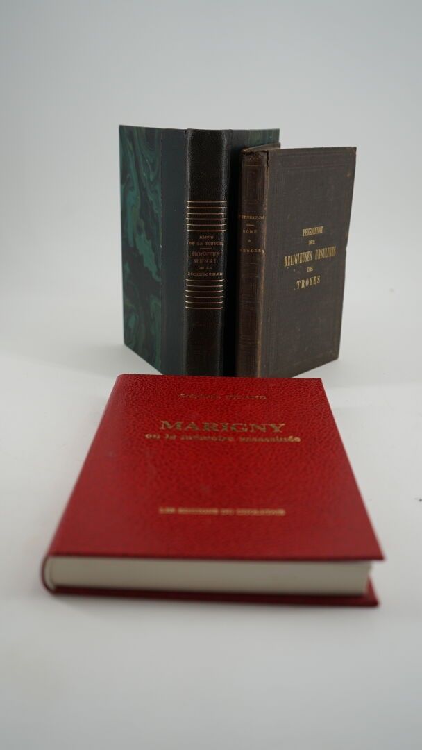 Set of 3 volumes - CRÉTINEAU-JOLY (J.) - Rome & Vendée. Scènes, tableaux et récits. Première série - Paris ; Bray et Retaux, 1876 - 1 volume In-12° - engraved frontispiece portrait (yellowed) - Bound in contemporary brown cloth - Spine titled in gold (upper headband rubbed) - Mention Pensionnat des religieuses Ursulines de Troyes in gilt lettering on 1st plate - Gilt edges - LA TOUSCHE D'AVRIGNY (Baron de) - Monsieur Henri. Henri de La Rochejaquelein 1772-1794 - Paris ; Émile-Paul, 1948 - In-8° - Contemporary black half-chagrin binding by Seguin - Covers preserved, the 1st illustrated with the portrait of La Rochejaquelein - Smooth spine decorated and titled in copper - Autograph signed letter from the author to 1 of the white endpapers - HILAND (Stéphane) - Marigny ou la mémoire assassinée - Sans lieu, Les Éditions du Choletais, 1998 - In-8° - Red skyvertex publisher's binding with gold titling - Numbered first edition (no. 14 out of a total print run of 100).