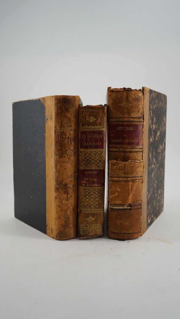 Set of 3 volumes In-8° - LA ROCHEJAQUELEIN (Madame la marquise de) - Mémoires de Madame la marquise de La Rochejaquelein - Paris; Dentu, Vaton et les principaux libraires, 1848 - Some scattered freckling, partial halos - 2 folding maps (1 small tear not missing) - Bound in contemporary fawn half-basin - Smooth spine decorated and titled in gold (rubbed) - Mention of 6th edition - GENLIS (Comtesse de) - Mémoires de Madame la marquise de Bonchamps, rédigés par Mme la comtesse de Genlis suivis de pièces justificatives - Paris; Baudoin Frères, 1823 - Contemporary binding in green glazed calf (jaws very rubbed and partially split, corners worn) - Roulette framing the boards - Smooth spine rubbed with small tears, headbands worn) - Marbled edges - SAINT-ARNAUD - Lettres du maréchal de Saint-Arnaud - Paris ; Michel Lévy Frères, 1855 - Volume I only - Engraved frontispiece portrait - Contemporary binding in worn half fawn morocco - Sold as is.