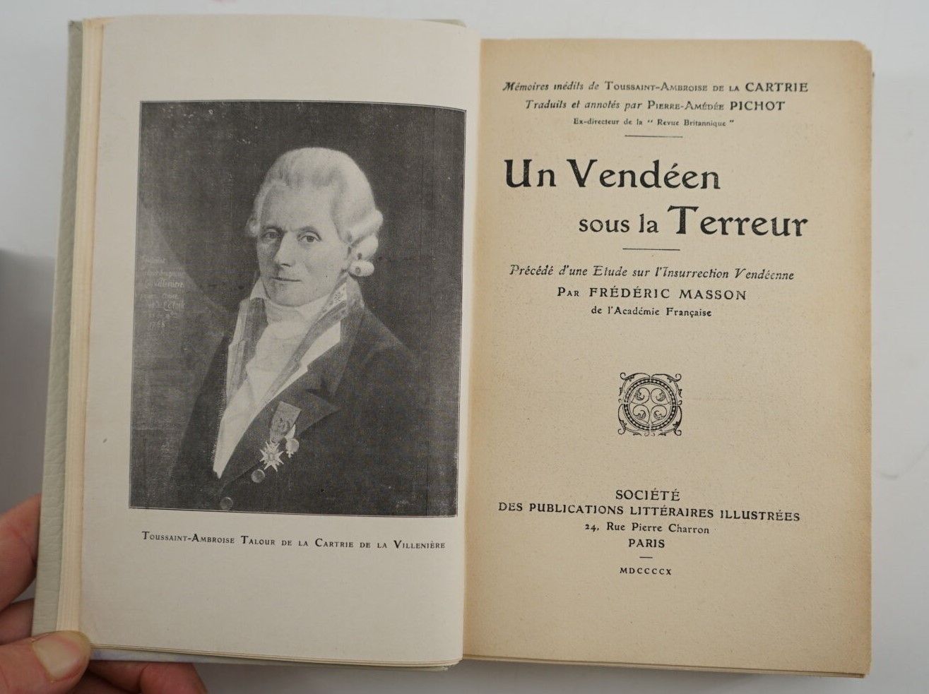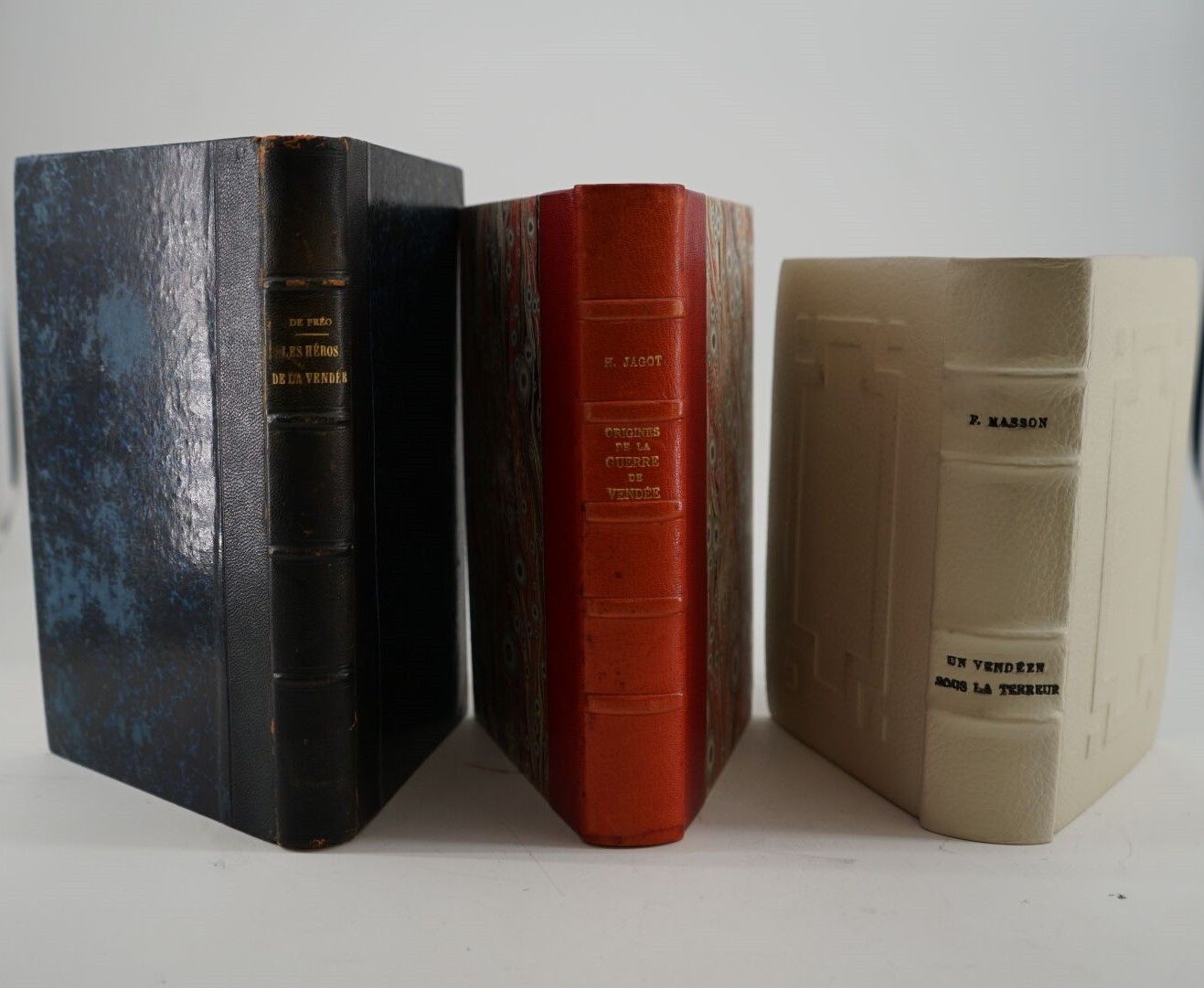 Set of 3 volumes In-8° - PRÉO (M. de) - Les héros de la Vendée, ou biographie des principaux chefs vendéens - Tours ; Ad. Mame et Cie, 1841 - Bound in contemporary black half-chagrin - Spine with gold titling - JAGOT (Henry) - Les origines de la guerre de Vendée - Paris ; Honoré Champion, 1914 - Bound in contemporary red half-chagrin - Covers preserved (faded) - Spine with gold titling - MASSON (Frédéric) - Mémoires inédits de Toussaint-Ambroise de La Cartrie. A Vendéen under the Terror. Précédé d'une étude sur l'Insurrection Vendéenne - Paris ; Société des Publications Littéraires Illustrées, 1910 - Off-text plates - Bound in the 2nd half of the 20th century in white chagrin - Covers mounted on strong paper preserved - Boards decorated with 1 geometrical cold decoration - Spine ribbed with black titles - Good overall condition.