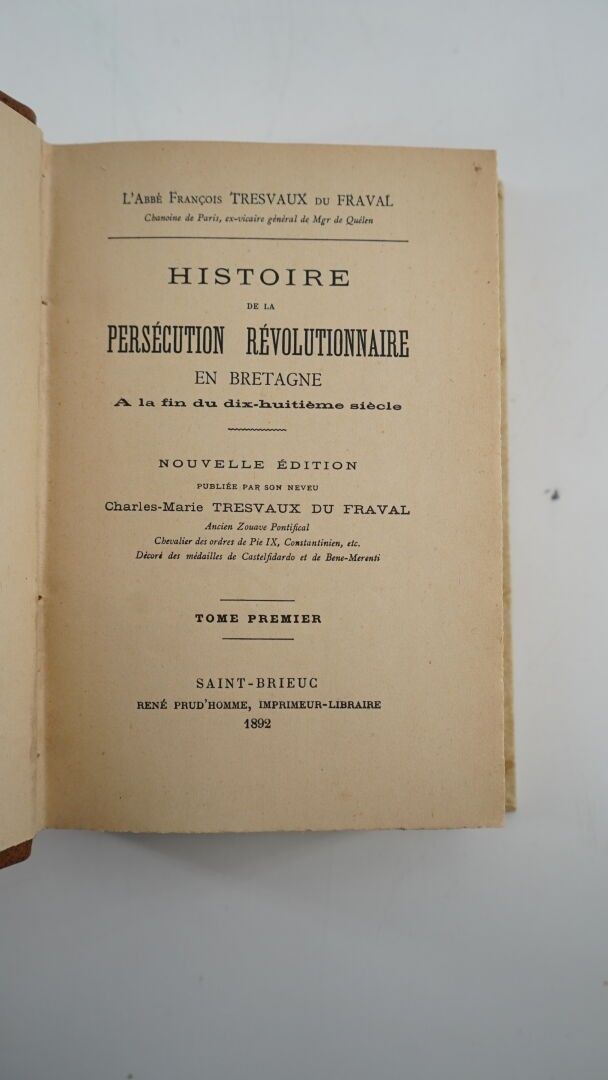 Set of 3 volumes In-8° - TRESVAUX DU FRAVAL (Abbé François) - Histoire de la persécution révolutionnaire en Bretagne à la fin du dix-huitième siècle - Saint-Brieuc ; René Prud'homme, 1892 - 2 volumes - Bound in the 2nd half of the 20th century in mottled havana half-basin - 1st illustrated covers preserved - Spine ribbed (faded) decorated with gilt ermine crosses, gilt title and tomaison - Heads spotted brown - Very good copy - LOUET (Abbé Joseph) - La chouannerie et le clergé constitutionnel dans un coin de la Bretagne ou les guerres religieuses pendant la Révolution - Rennes ; M. L. Rahon-Rault, Fougères ; Mme Gendron-Brissier, [1909] - Identical binding - Wet bookplate: Victor Le Voyer, notary, handwritten ex-dono - Very good set.