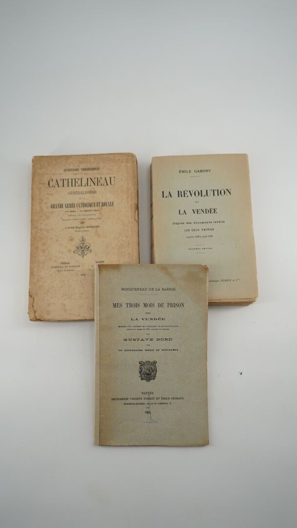 Set of 3 In-8° paperback volumes - MOCQUEREAU DE LA BARRIE - Mes trois mois de prison dans la Vendée. Mémoires d'un Capitaine des volontaires de Sillé-le-Guillaume envoyé en Vendée en 1793, publiés et annotés par Gustave Bord - Nantes ; Imprimerie Vincent Forest et Émile Grimaud, 1882 - Reinforced spine - Some brown spots - 1 facsimile frontispiece - BOSSARD (Abbé Eugène) - Questions vendéennes. Cathelineau generalissimo of the Grande Armée catholique et Royale (13 March-14 July 1793). Réponse à M. Célestin Port - Paris ; Lamulle et Poisson, Niort ; L. Clouzot, 1893 - 1 volume In-8° paperback with printed cover (faded, book uncropped) - Freckles at the beginning of the volume - Title in red and black ink - Facsimile of General Cathelineau in the frontispiece and 2 fold-out facsimiles out of the text - Good copy in the original edition - Reference: Lemière, 47 - GABORY (Émile) - La Révolution et la Vendée d'après des documents inédits. Les deux patries. Janvier 1789 à août 1793 - Paris ; Perrin et Cie, 1925.