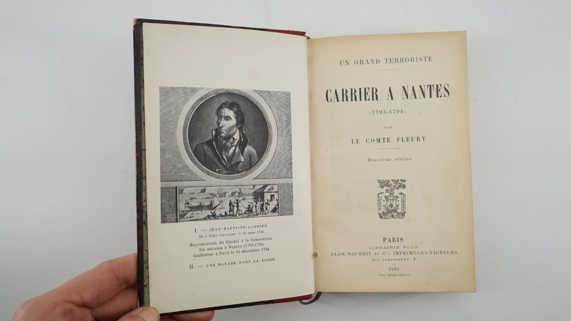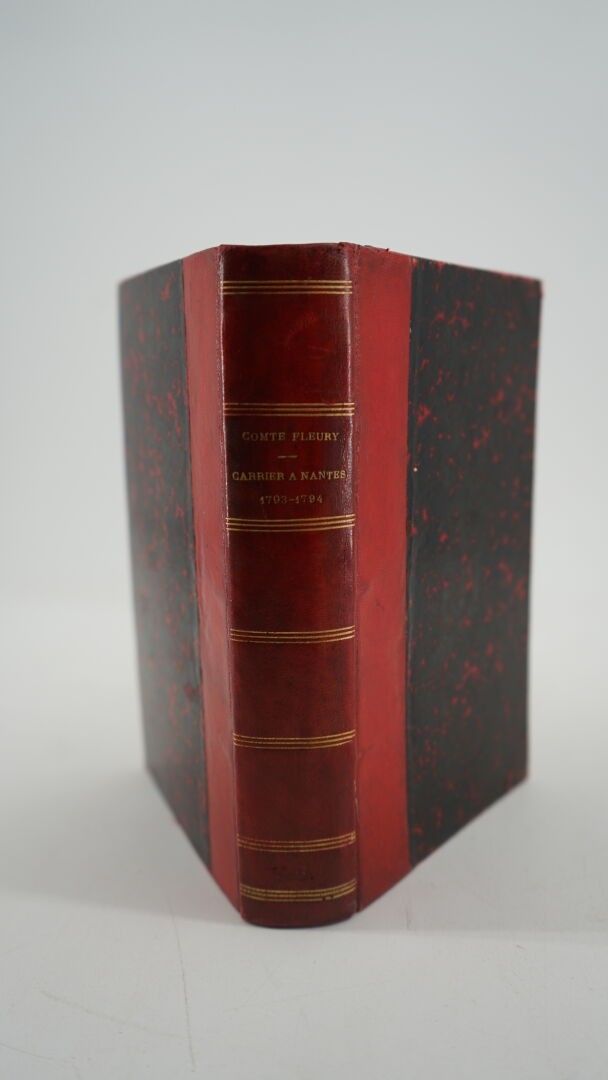 FLEURY (Comte) - Un grand terroriste. Carrier à Nantes (1793-1794) - Paris ; Plon-Nourrit et Cie, 1901 - 1 volume In-12° - 1 frontispiece plate with a portrait of Carrier and 1 scene of the drownings - Bound in contemporary cherry half-basin - Smooth spine decorated and titled in gold, monogram Y. S. at tail - A good copy of the 2nd edition.