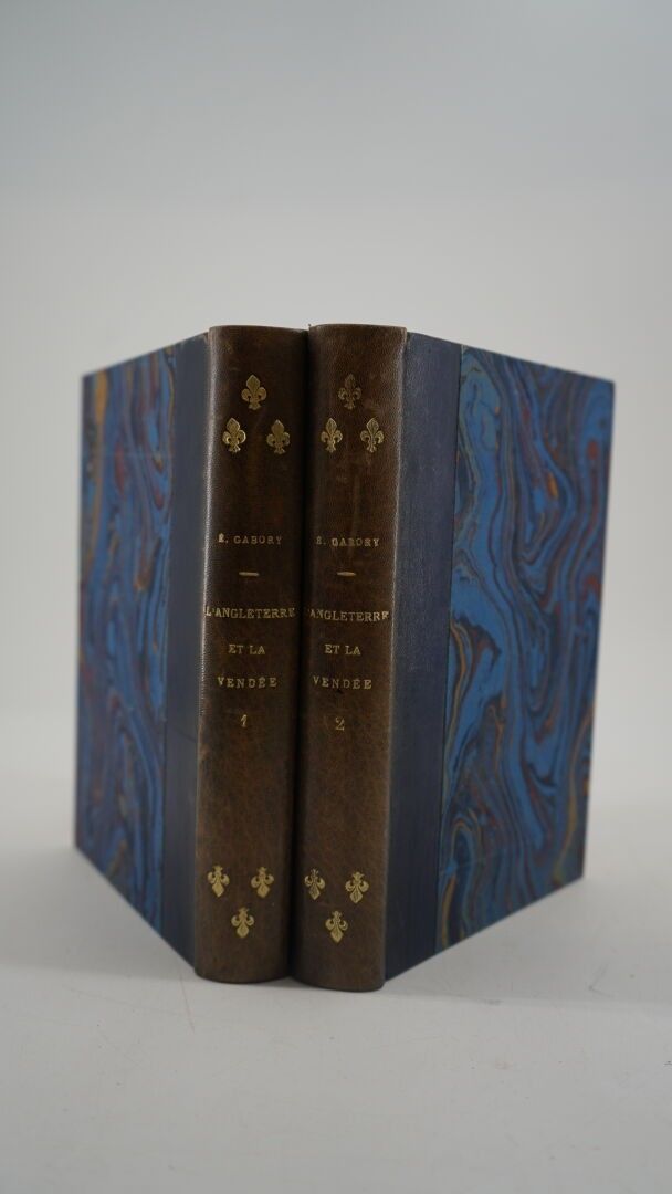 GABORY (Émile) - L'Angleterre et la Vendée d'après des documents inédits. Granville - Quiberon - L'île d'Yeu - Paris ; Perrin et Cie, 1930 - 2 volumes In-8° - Slightly later half navy brown binding signed L. Le Hir - Covers preserved - Smooth spines (faded) decorated with fleur-de-lys, titled and toméed in gold - Red edges - Good copy.