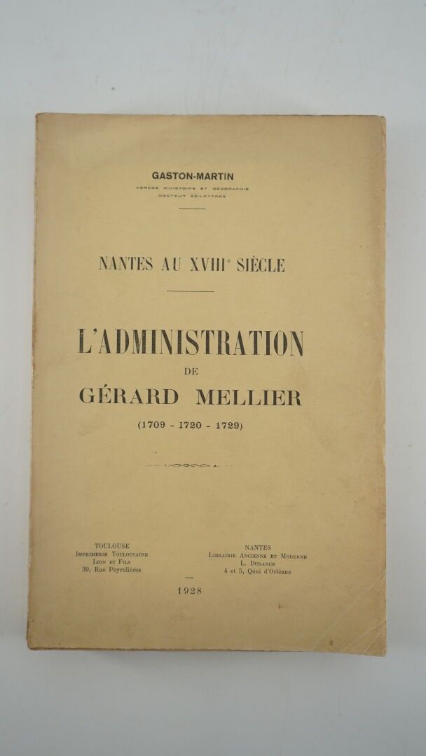 GASTON (Martin) - Nantes in the 18th century. L'administration de Gérard Mellier (1709-1720-1729) - Toulouse ; Imprimerie Toulousaine Lion et Fils, Nantes ; Librairie Ancienne et Moderne L. Durance, 1928 - 1 volume In-8° paperback (volume I, the only one published) partly uncut (small marginal tears on the 2nd plate) - Good copy.