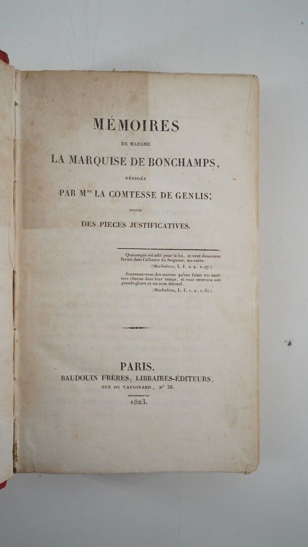 GENLIS (Comtesse de) - Mémoires de Madame la Marquise de Bonchamps suivis de pièces justificatives - Paris ; Baudoin Frères, 1823 - Hardback : ROCHEJAQUELEIN (Madame la Marquise de) - Mémoires de Madame la Marquise de La Rochejaquelein écrit par elle-même, et rédigés par M. de Barante - Paris ; Baudoin Frères, 1823 - 1 large volume In-8° - Bound in red Bradel style boards - Titles in havana leather on the spine (faded) - A good copy forming part of the Collection des Mémoires relatifs à la Révolution française.