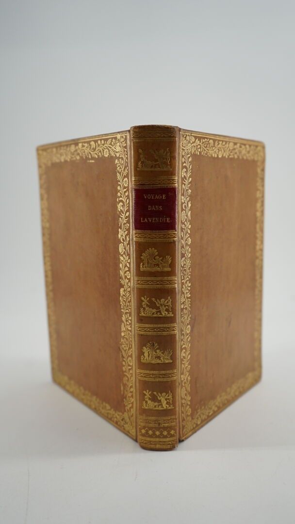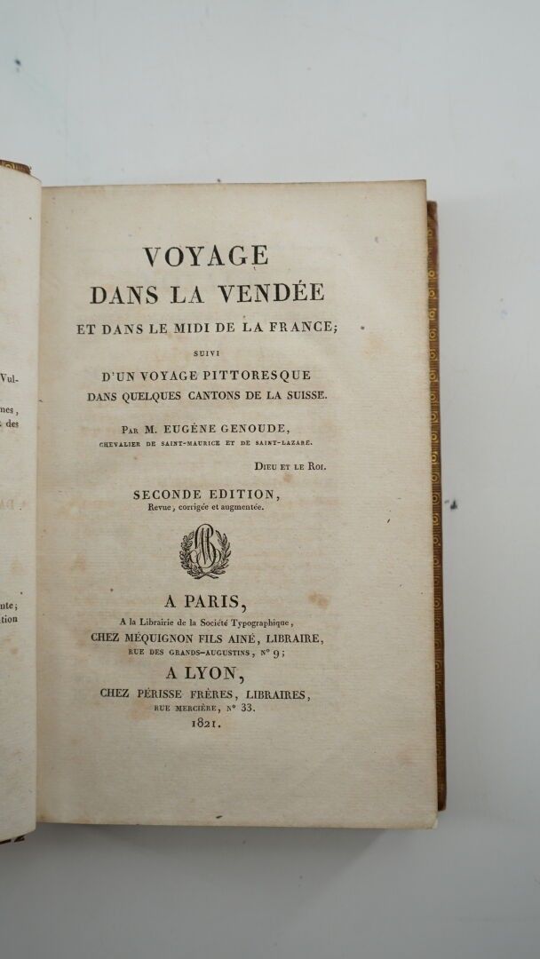 GENOUDE (Eugène) - Voyage dans la Vendée et dans le midi de la France ; suivi d'un voyage pittoresque dans quelques cantons de la Suisse - Paris ; Méquignon Fils Aîné, Lyon ; Périsse Frères, 1821 - 1 volume In-8° - Contemporary binding in glazed fawn calf (small lack at the bottom of the 1st jaw) - Fillet, roulette and frieze framing the covers - Smooth spine nicely decorated with putti - Marbled edges - Very good copy in 2nd edition.