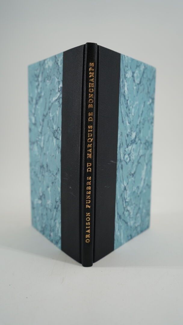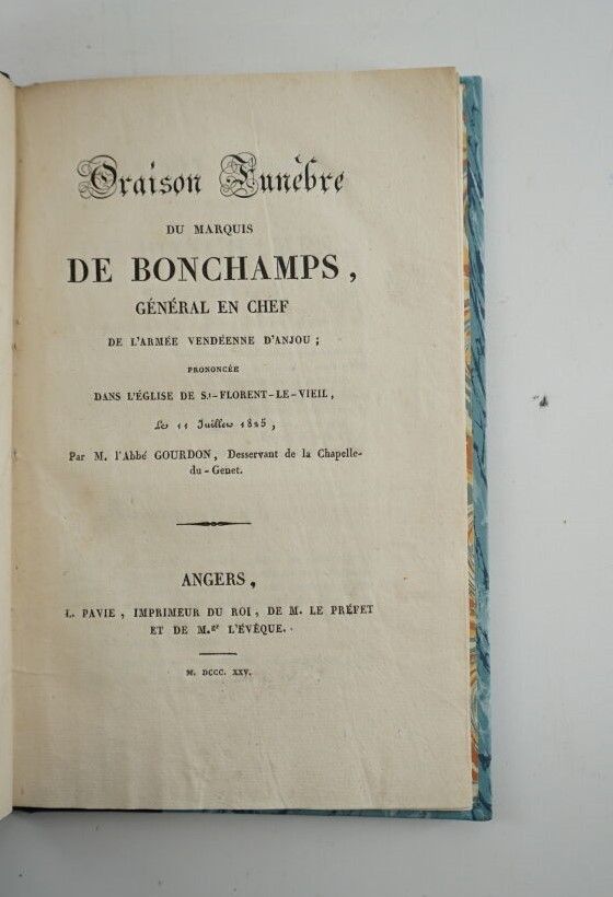 GOURDON (Abbé) - Oraison funèbre du marquis de Bonchamps, général en chef de l'armée vendéenne d'Anjou ; prononcée dans l'église de St-Florent-le-Vieil, le 11 juillet 1825 - Angers ; L. Pavie, 1825 - 1 volume In-8° - Bound in the 2nd half of the 20th century in navy half-chagrin à la Bradel - Spine titré or en long - Very good first edition copy, sold "50 centimes, au profit des Vendéens".