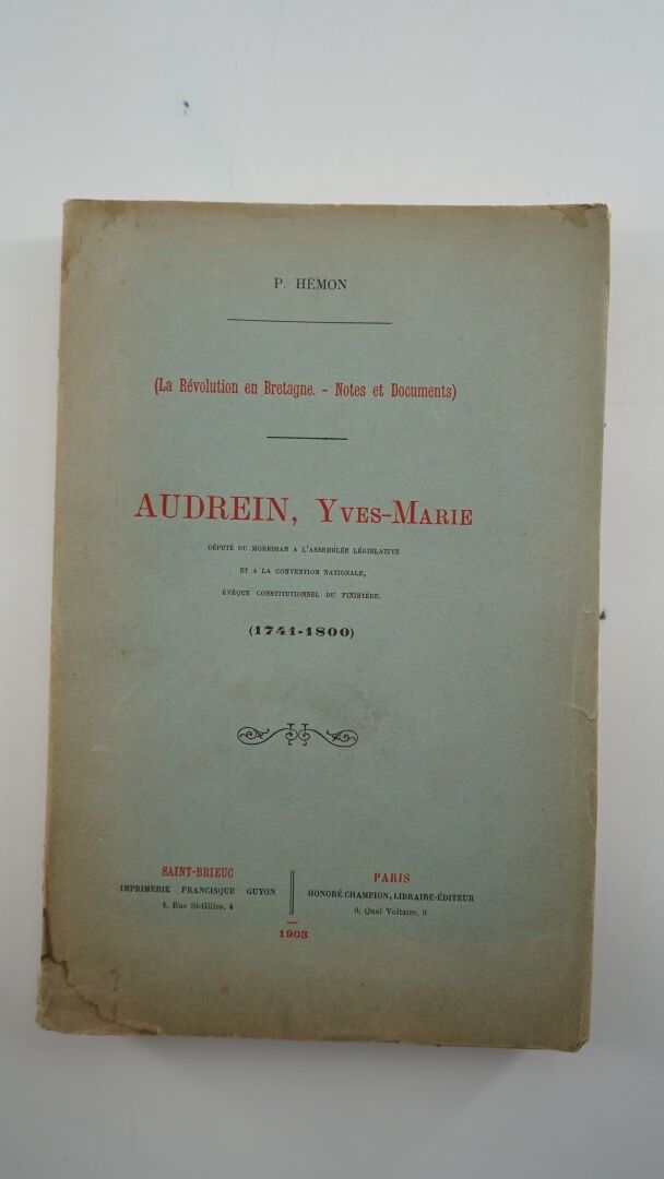 HÉMON (P.) - La Révolution en Bretagne - Notes et documents - Audrein, Yves-Marie député du Morbihan à l'Assemblée législative et à la Convention Nationale, évêque constitutionnel du Finistère (1741-1800) - Saint-Brieuc ; Imprimerie Francisque Guyot, Paris ; Honoré Champion, 1903 - 1 volume In-8° broché en partie non coupé - 1 auréole en marge supérieure - Good copy however.