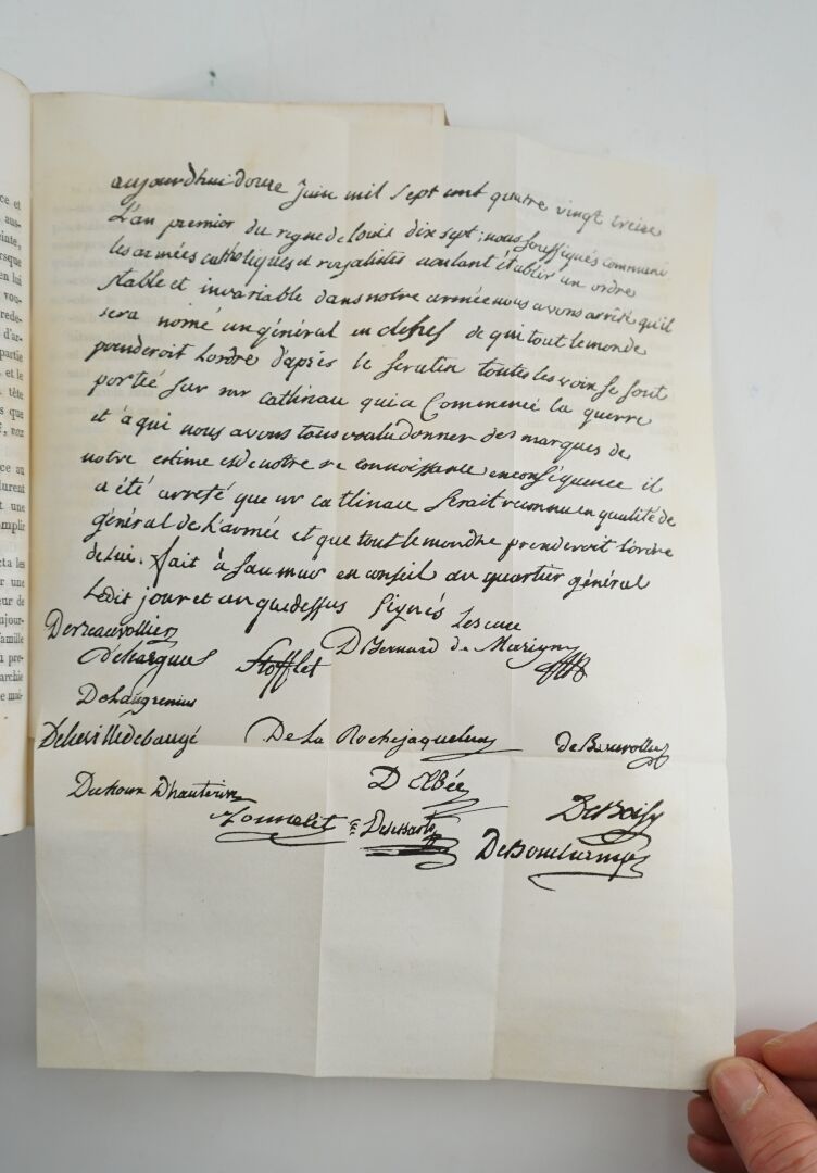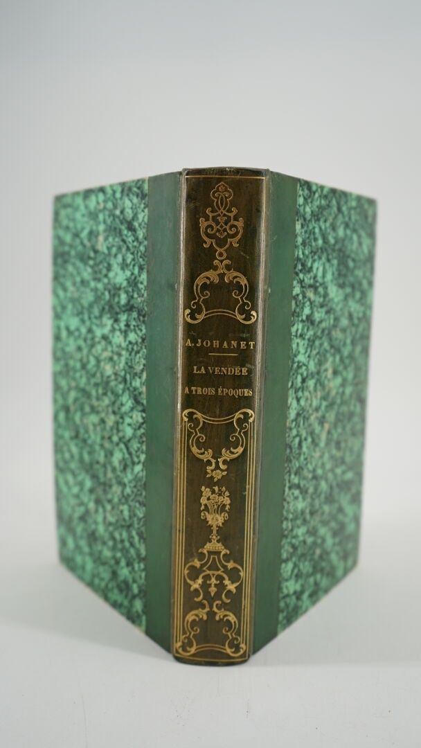 JOHANET (Auguste) - La Vendée à trois époques de 1793 jusqu'à l'Empire 1815-1832 - Paris ; Dentu, 1840 - 2 volumes in 1 volume In-8° - A few rare brown spots at the beginning of the work - Facsimile of Cathelineau's brevet de généralissime folded out of the text - Bound in contemporary green half calf - Smooth spine decorated with rocaille fillets and decorations, titled in gold (slightly darkened) - A very good first edition copy. The 1st volume is devoted to the Vendée wars during the Revolution, the 2nd to the troubles that shook the region in 1814-1815 and in 1831-1832. The author was a lawyer and always defended Vendée political prisoners.