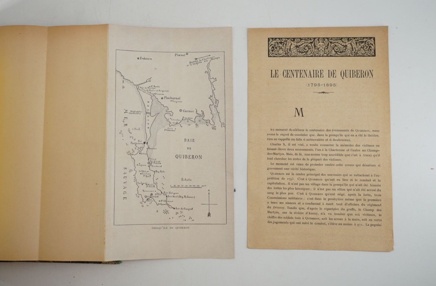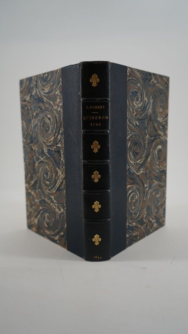 ROBERT (Charles) - 1795 Expedition of the émigrés to Quiberon. The Count of Artois on the island of Yeu according to French and English documents [...] - Paris ; Lamulle & Poisson, [1899] - 1 volume In-8° - 2 folding maps in fine - Bound in black half-chagrin - Covers preserved - Spine ribbed and decorated with fleurs de lys and titled and dated in gold - Brown head - A very good copy in an uncommon first edition to which is attached 1 subscription coupon for the construction of 1 commemorative church in Quiberon in memory of the victims on the occasion of the centenary of the events.