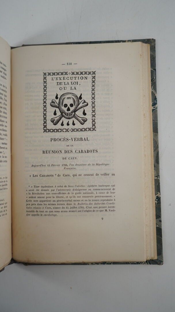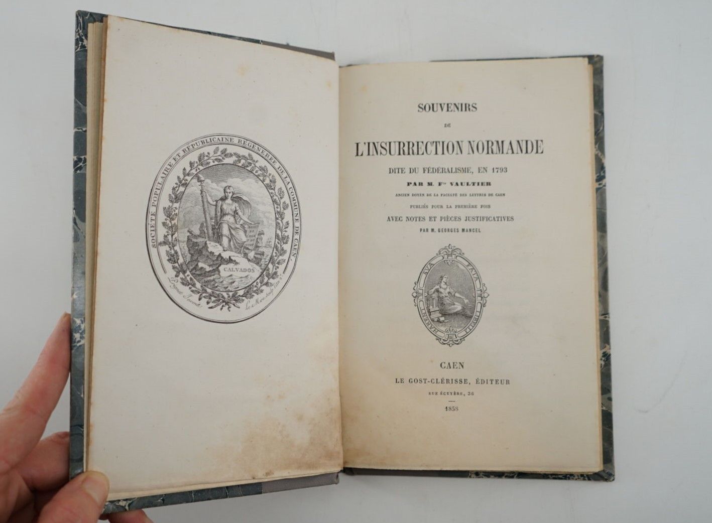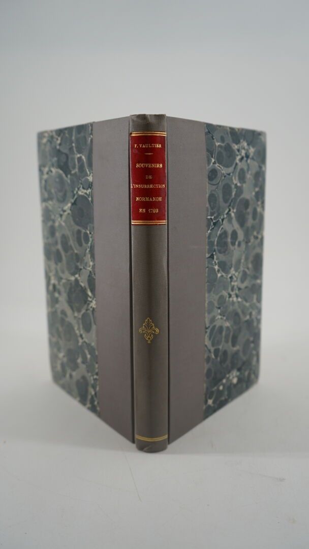 VAULTIER (Frédéric) - Souvenirs de l'insurrection normande dite du Fédéralisme, en 1793 publiés pour la première fois avec notes et pièces justificatives par M. Georges Mancel - Caen ; Le-Gost-Clérisse, 1858 - 1 volume In-8° - 1 engraved frontispiece - Binding slightly later half grey cloth à la Bradel - 1st cover preserved - Spine decorated with fillets and 1 fleur de lys, burgundy morocco title page - Good copy in first edition.