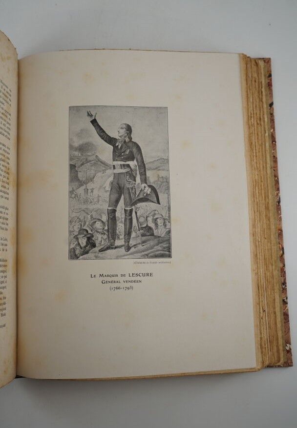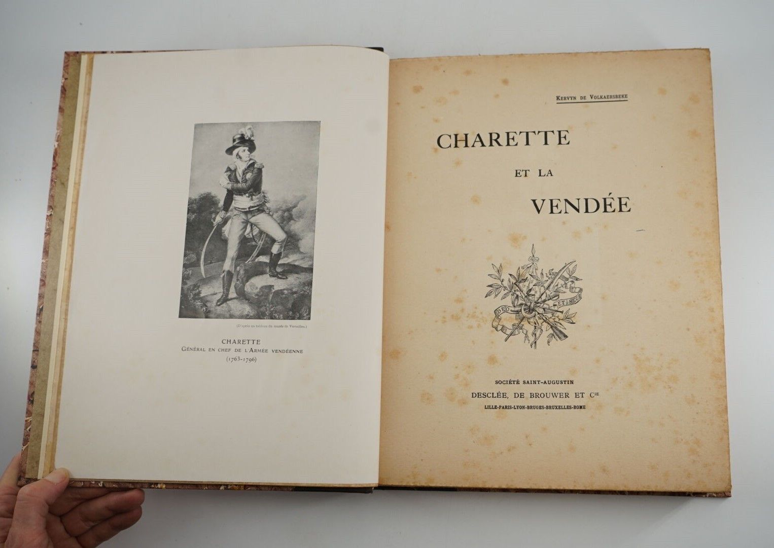 VOLKAERSBEKE (Kervyn de) - Charette et la Vendée - Lille, Paris, Lyon, Bruges, Bruxelles, Rome ; Société Saint-Augustin, Desclée, de Brouwer et Cie, [circa 1920] - 1 large volume In-4° - Some foxing to text leaves - Frontispiece and plates out of text - Bound 2nd half of 20th century in brown half calf - Blue covers richly decorated in gold and black with vignette in black on 1st plate - Spine ribbed with gold titling.