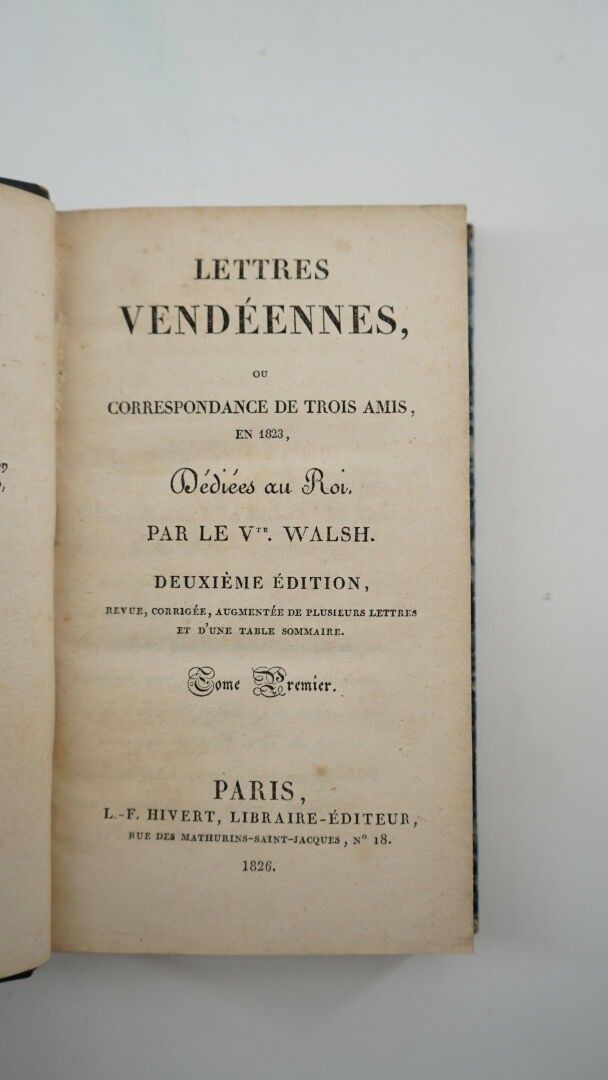WALSH (Vicomte) - Lettres vendéennes, ou correspondance de trois amis en 1823, dédiées au roi - Paris ; L.-F. Hivert, 1826 - 3 volumes In-12° - A few small scattered brown spots - Bound in contemporary half navy calf (1 jaw partially split) - Spines smoothly decorated, titled and toméed in gold (some slight rubbing) - Beige edges - Ex-libris label: Christophori MacCartan - A good copy in 2nd edition.