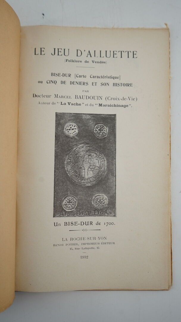 BAUDOUIN (Docteur Marcel) - Folklore de Vendée. Le jeu d'Alluette (Folklore de Vendée). Bise-dur (carte caractéristique) ou cinq de deniers et son histoire - La Roche-sur-Yon ; Henri Potier, 1932 - 1 volume In-8° paperback under cover illustrated with 1 vignette on the 1st plate - 17 figures in text - Good copy.