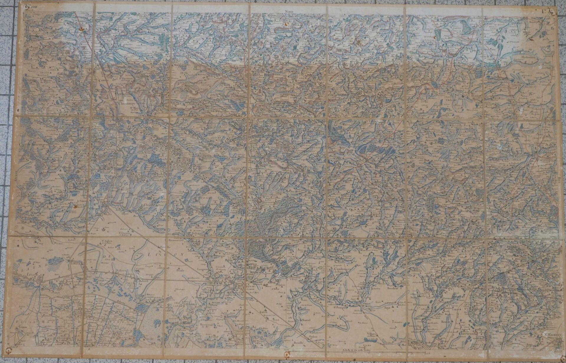 [GEOGRAPHICAL MAP] - CASSINI DE TURY - 18th century map of 1 part of the Vendée from Sainte-Florence to Luçon in the west and from Boussay to Saint-Maixent in the east with Fontenay-le-Comte. Label of the Parisian merchant Goujon with old writing indicating Luçon and Puyravault and the locality of Mervent annotated later in pen on the reverse - Contours coloured at the time - 60X93 cm - Wrapped - Important brown halo, traces of rusty tacks - As is.