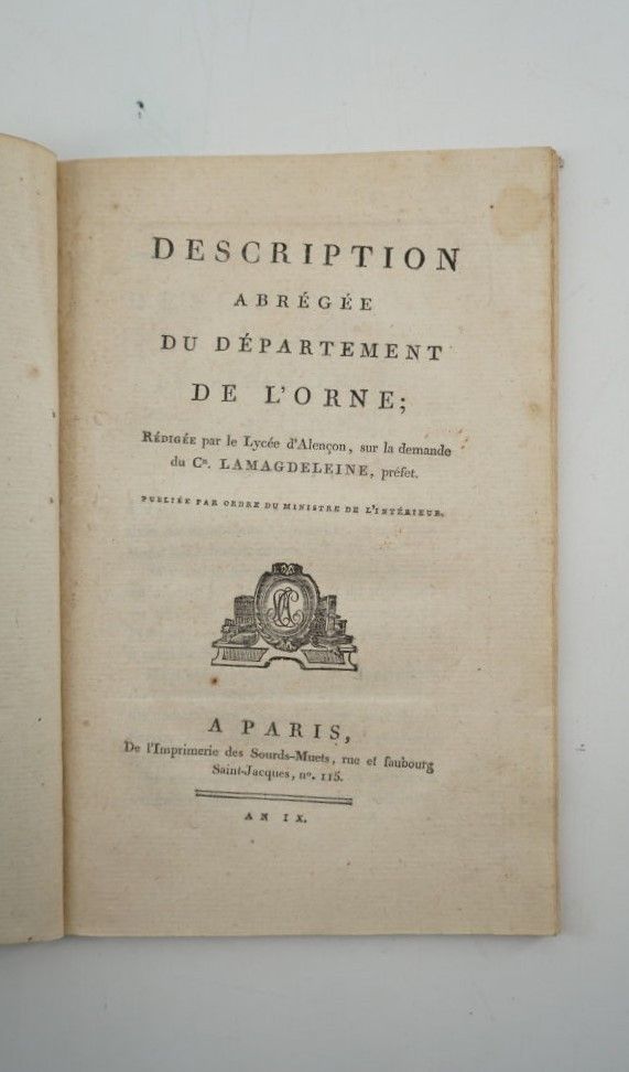 [COLLECTIVE] - Description abrégée du département de l'Orne ; rédigée par le Lycée d'Alençon, sur la demande du Cn. Lamagdeleine, préfet - Paris ; Imprimerie des Sourds-Muets, an IX [1801] - 1 pamphlet In-8° paperback with modern muffled cover - 56 pages.