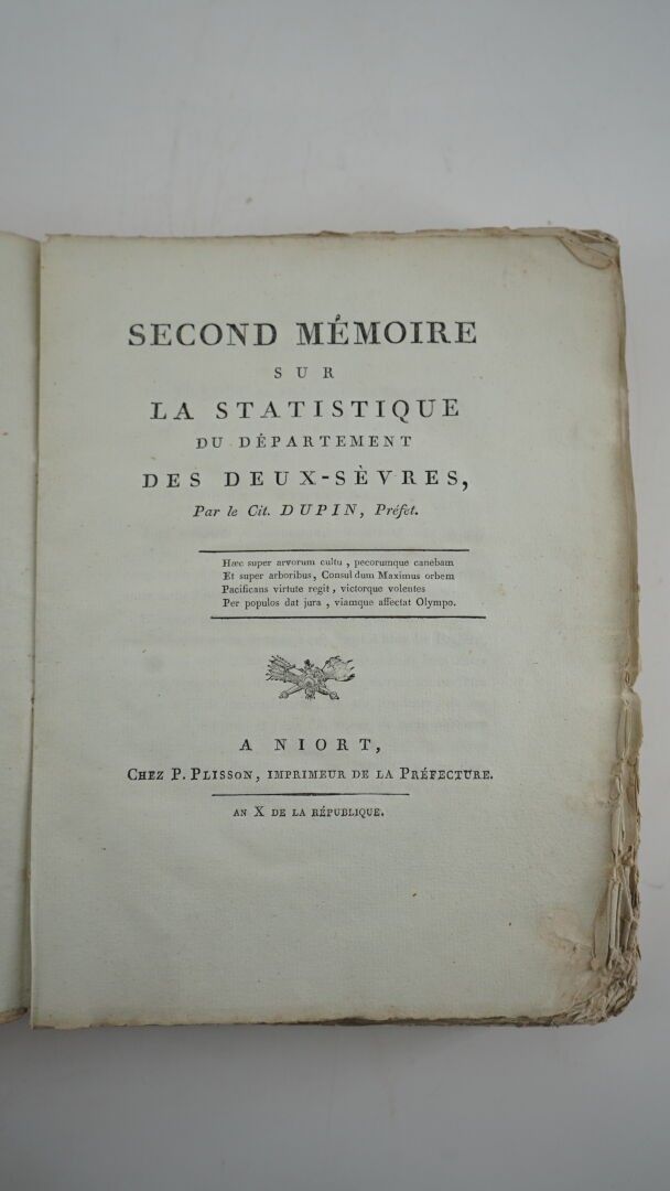 DUPIN (Citoyen) - Second mémoire sur la statistique du département des Deux-Sèvres - Niort ; P. Plisson, an X [1802] - 1 volume In-4° paperback in paperback cover (missing, tears, spine almost raw, binding weak) - Some pages nicked - Copy free of foxing, to be bound.