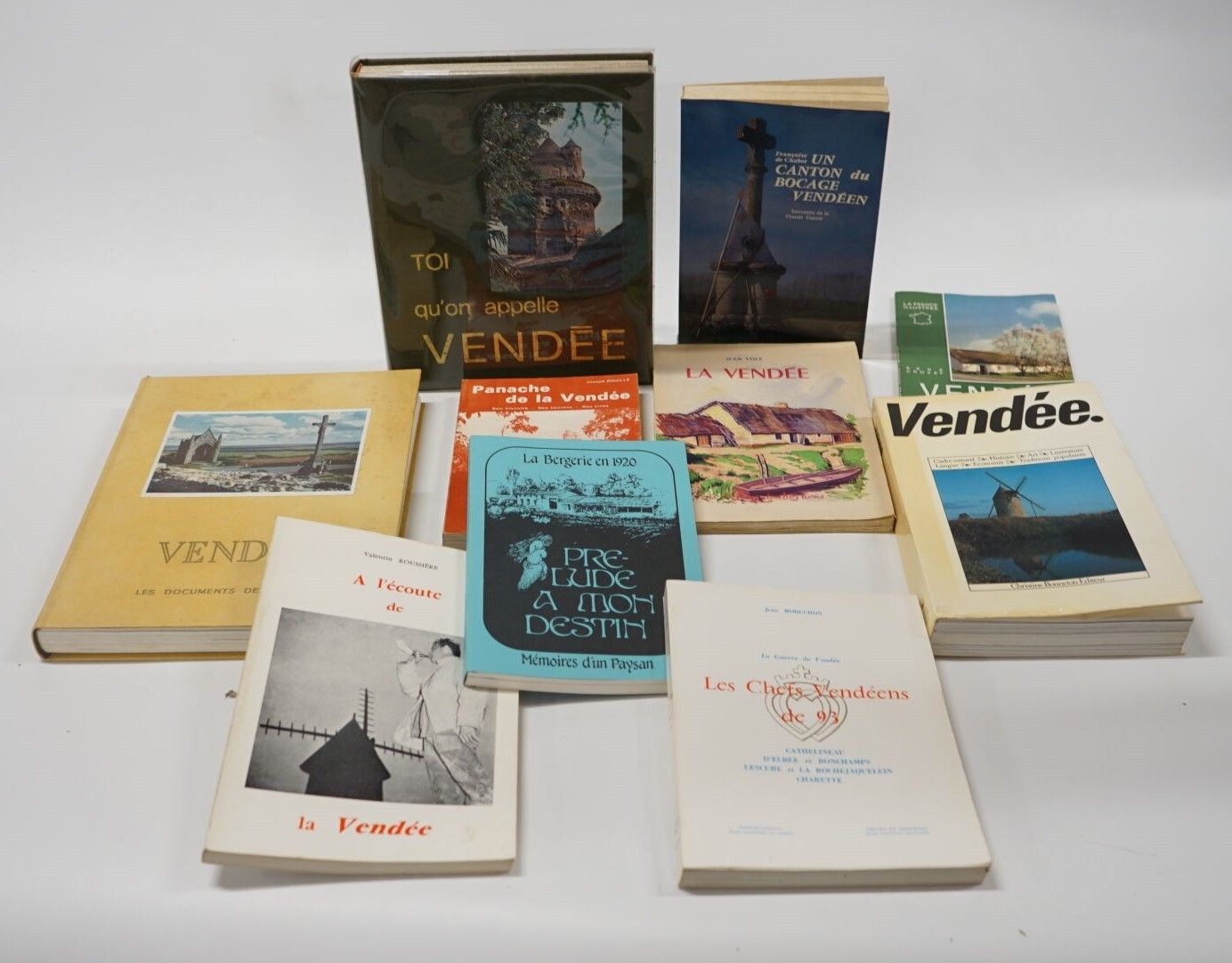 Set of 10 volumes on the Vendée, bound or paperback - ROUSSIÈRE (Valentin) - A l'écoute de la Vendée - YOLE (Jean) - La Vendée - CHABOT (Françoise de) - Un canton du bocage vendéen. Memories of the Great War - La Bergerie in 1920. Prélude à mon destin - Mémoires d'un paysan - ROUILLÉ (Joseph) - Panache de la Vendée - GAUDUCHEAU (C.) - Toi qu'on appelle Vendée - GALLOT (Jean-André, directeur) - Vendée. Aspect géographique, historique, touristique, économique et administratif du département - [COLLECTIF] - Vendée. Cadre naturel. Historie. Art. Literature. Language. Economy. Popular traditions - CROZET (René) - Vendée marias poitevin - ROBUCHON (Jean) - La Guerre de Vendée. Les chefs vendéens de 93. Cathelineau, d'Elbée and Bonchamps, Lescure and La Rochejaquelein, Charette - Good condition.
